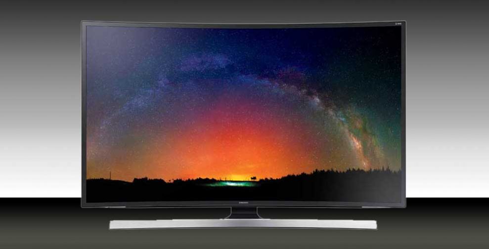 UE55JS8505 kombinerer buet design med en slank, mørkegrå ramme og en elegant, centralt monteret fod. Den blanke skærmoverflade er imidlertid lidt præget af spejlinger, som bliver konkave på grund af den buede form.