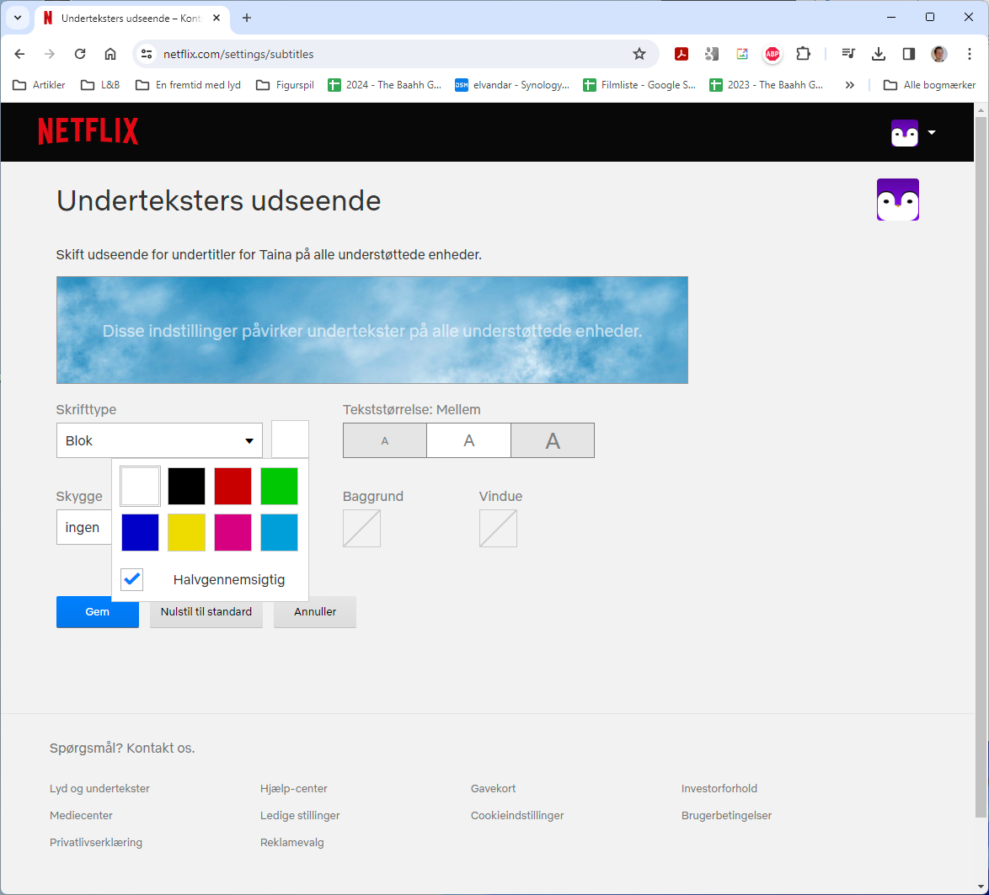 Under Underteksters udseende findes valgmuligheden Skrifttype og en rude, som angiver farven på teksten. Der er ingen separat indstilling for lysstyrke, men ved at vælge indstillingen Halvgennemsigtig reducerer man i praksis lysstyrken til det halve. Du kan også teste med andre farver og skriftstørrelser, hvis du ønsker det. Gul kan føles mere behagelig end blændende hvid.