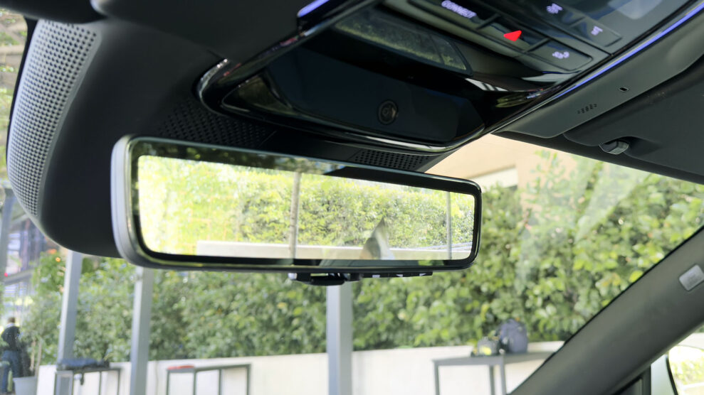 Så med det af vejen er det tid til at tage fat på elefanten i rummet: Det elektriske bakspejl, eller skærm, som det egentlig er. Grunden til, at det er der i stedet for et almindeligt spejl, er, som alle ved, at Polestar har flyttet taglinjen længere tilbage for at skabe mere plads på bagsædet. Især i højden. Det betyder, at bagruden må vige for en tværbjælke i taget, som er placeret der, hvor bagruden normalt ville være limet fast.