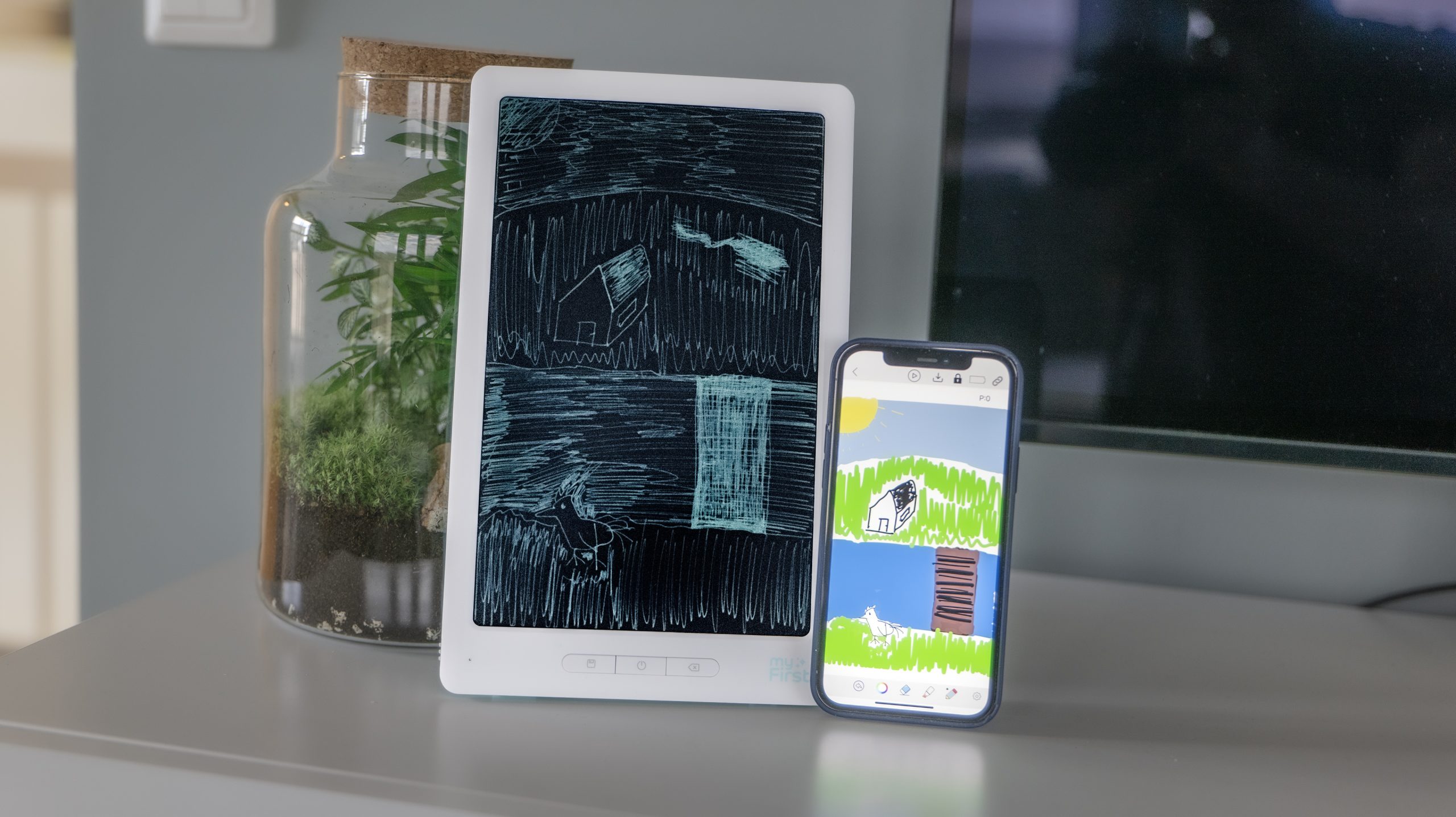 Men magien starter, når man downloader Sketch Book-app’en. Så kan barnet nemlig tegne på tegnetavlen, mens stregerne overføres til mobil eller tablet – direkte. I app’en kan man vælge forskellige farver, så de monokrome tegninger på tegnetavlen forvandles til farverige kreationer på mobilen.