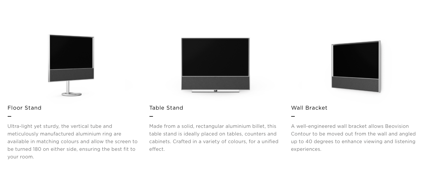 B&O har også lagt vægt på, at TV’et skal være let at placere diskret: Det kan monteres direkte på væggen via et særligt vægbeslag, på et TV-møbel eller på en specialdesignet, drejelig gulvstander i aluminium, hvor der også er lagt til rette for skjult kabelføring.