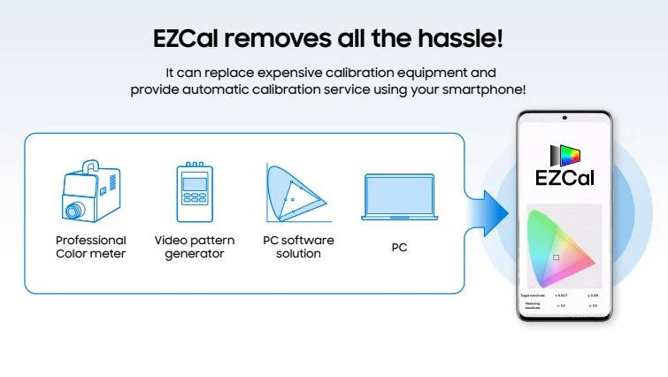 Samsung EZCal er en ny mobil-app, der automatisk kalibrerer TV’ets billedkvalitet uden behov for eksperthjælp eller dyre måleinstrumenter. App’en bruger simpelthen telefonens indbyggede kamera til at måle og korrigere farvegengivelsen.