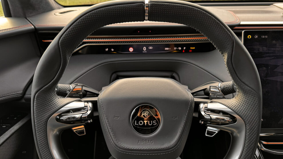 Eftersom vi har at gøre med en Lotus, er det absolut på sin plads at sige noget om køreoplevelsen. Til dem, der undrer sig: Ja, selvfølgelig kan man mærke vægten. Det gør man i alle SUV’er, også her, men den er bedre camoufleret. Styretøjet er det første, man lægger mærke til, det minder om en Porsche Taycan. Skarpt, præcist, med kort ratrespons og nuanceret feedback. Man har god føling med, hvor hjulene er, og bilen er nem at placere i svingene.