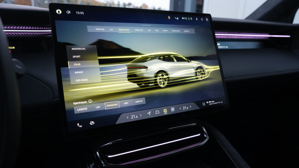 Skærmen foran føreren er en OLED-stribe, som viser de vigtigste informationer. Passageren får også en skærm med mediekontrol, mens resten af informationerne og indstillingerne foretages på touchskærmen i midten af instrumentbrættet. Afhængigt af udstyrsversionen fås der også en skærm til passagererne på bagsædet med betjening af sædevarme og klimaanlæg bagtil.