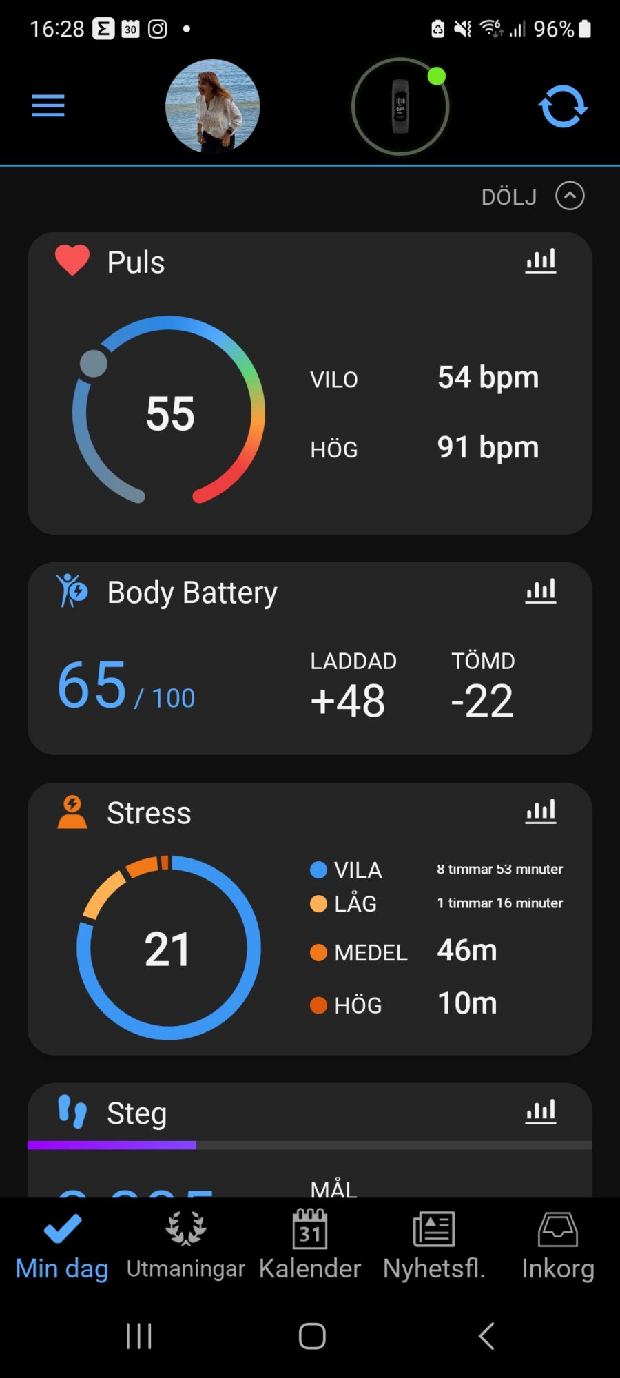 Det meste med Garmin Vivosmart 5 foregår i app’en, det er her, du tilpasser det meste af indholdet og det er også her, du logger din egen, eller din partners, menstruationscyklus.