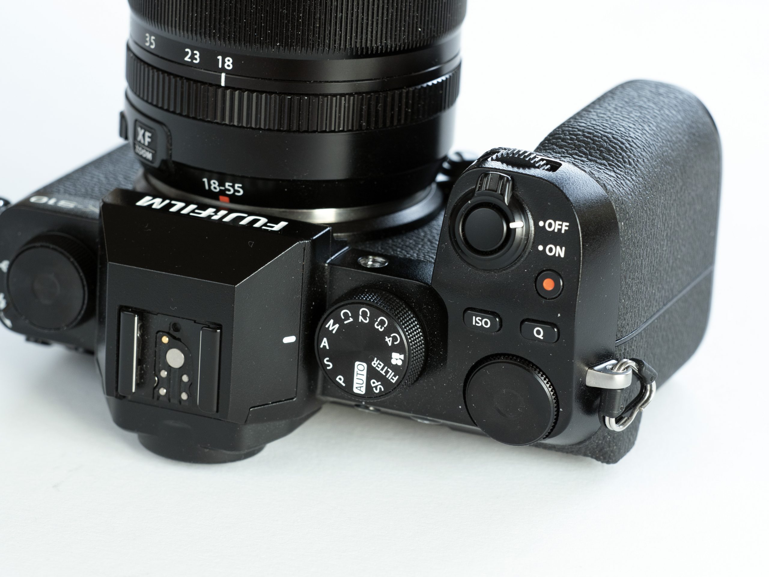 De analoge indstillingshjul får man ikke her. Flere af funktionsvalgene på X-T4 er flyttet fra knapper og indstillingshjul til skærmmenuen på X-S10. Et programhjul erstatter lukkertidshjulet, og knapper og hjul er stort set placeret som på X-T30.