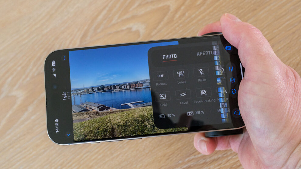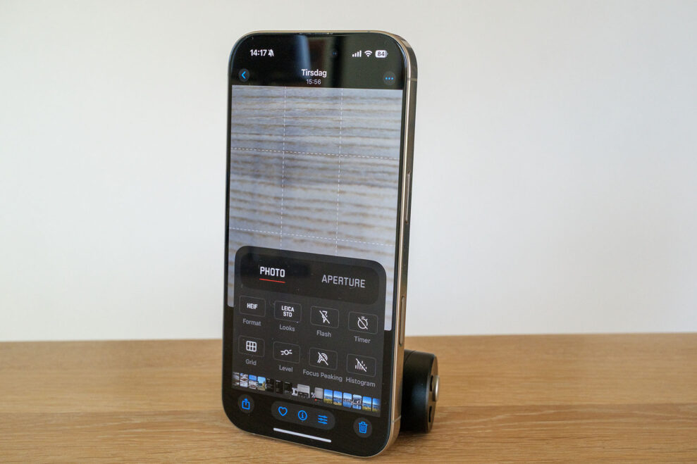 Det er ret flot udført, må jeg medgive, og app’en har en menu til valg af indstillinger som f.eks. billedformater – og her kan man vælge mellem RAW og RAW Pro – hvor RAW Pro gemmer billederne som en 10-bit DNG-fil. Det er også muligt at få vist et histogram, og der kan tilføjes focus peaking på skærmen. Hvis du klikker fra Photo til Aperture i app’en, kan du indstille blændeværdier fra f1,4 med indstillingshjulet på forsiden af grebet.