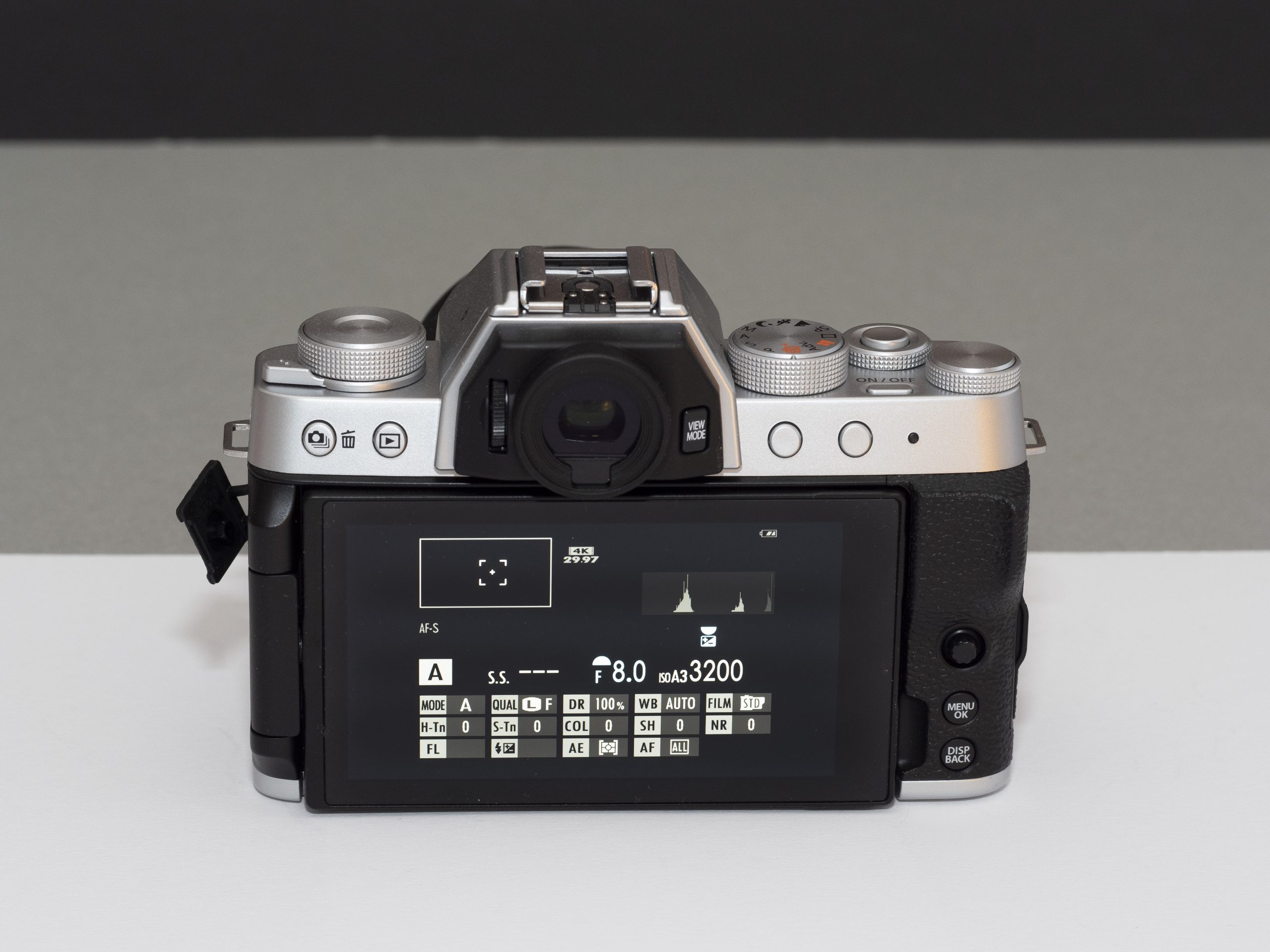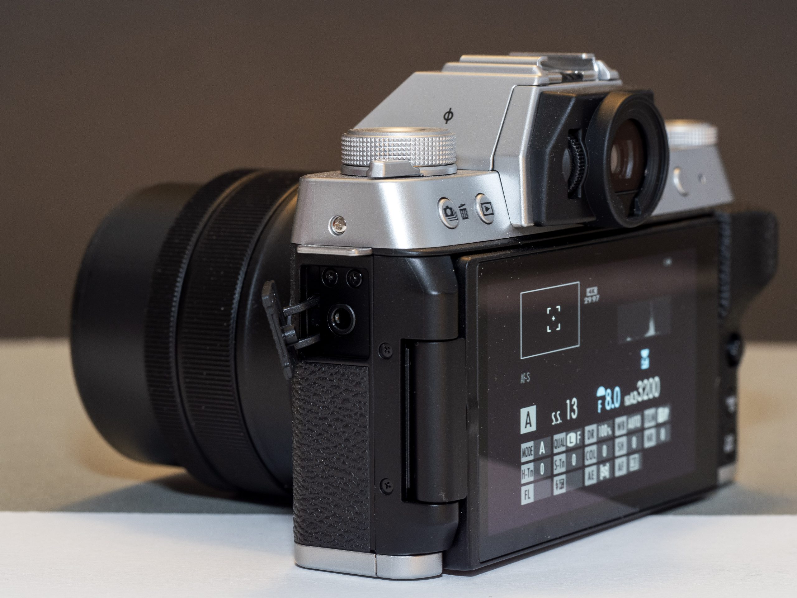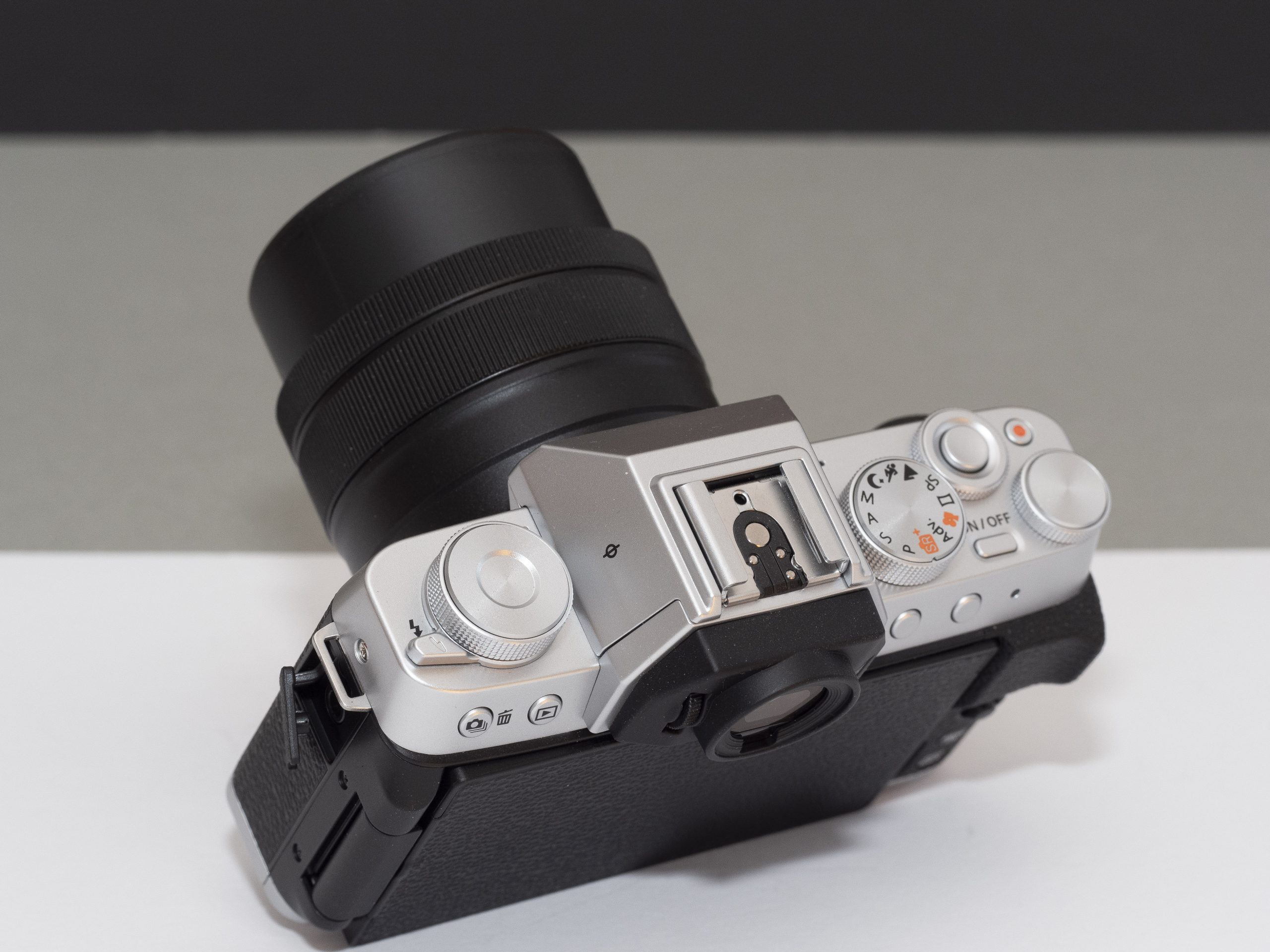 Den indbyggede blitz vippes op med knappen på venstre side af søgeren, der er den samme som på X-T100.