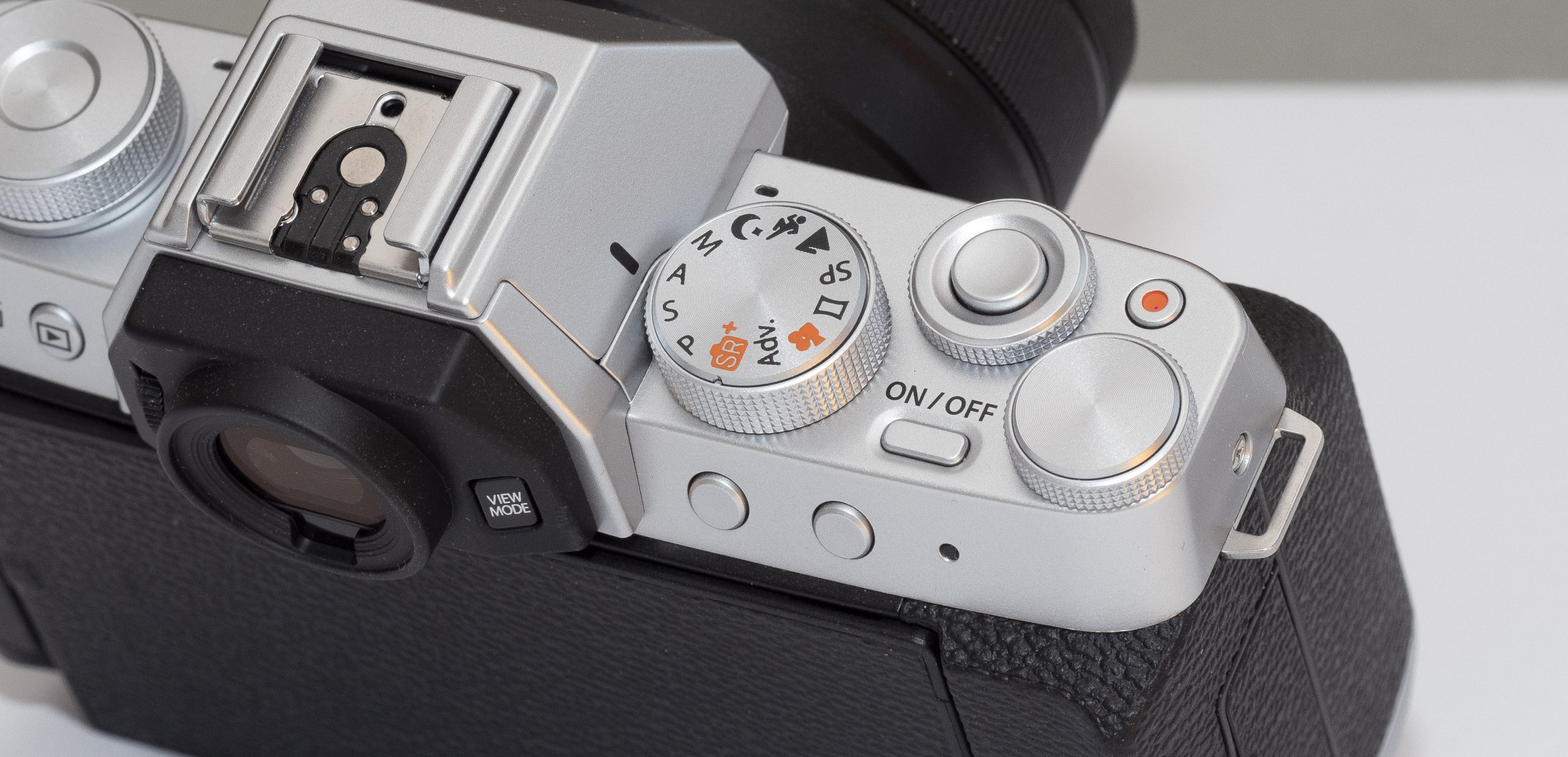 Det umærkede indstillingshjul til venstre for søgeren kan fungere som lukkertidshjul på video. Eller man kan vælge filmsimulering og få delt visning på skærmen, der viser effekten af den valgte simulering – f.eks. sort-hvid, sepia, Astia, Velvia, Provia, Pro-neg eller Fujis Classic Chrome.