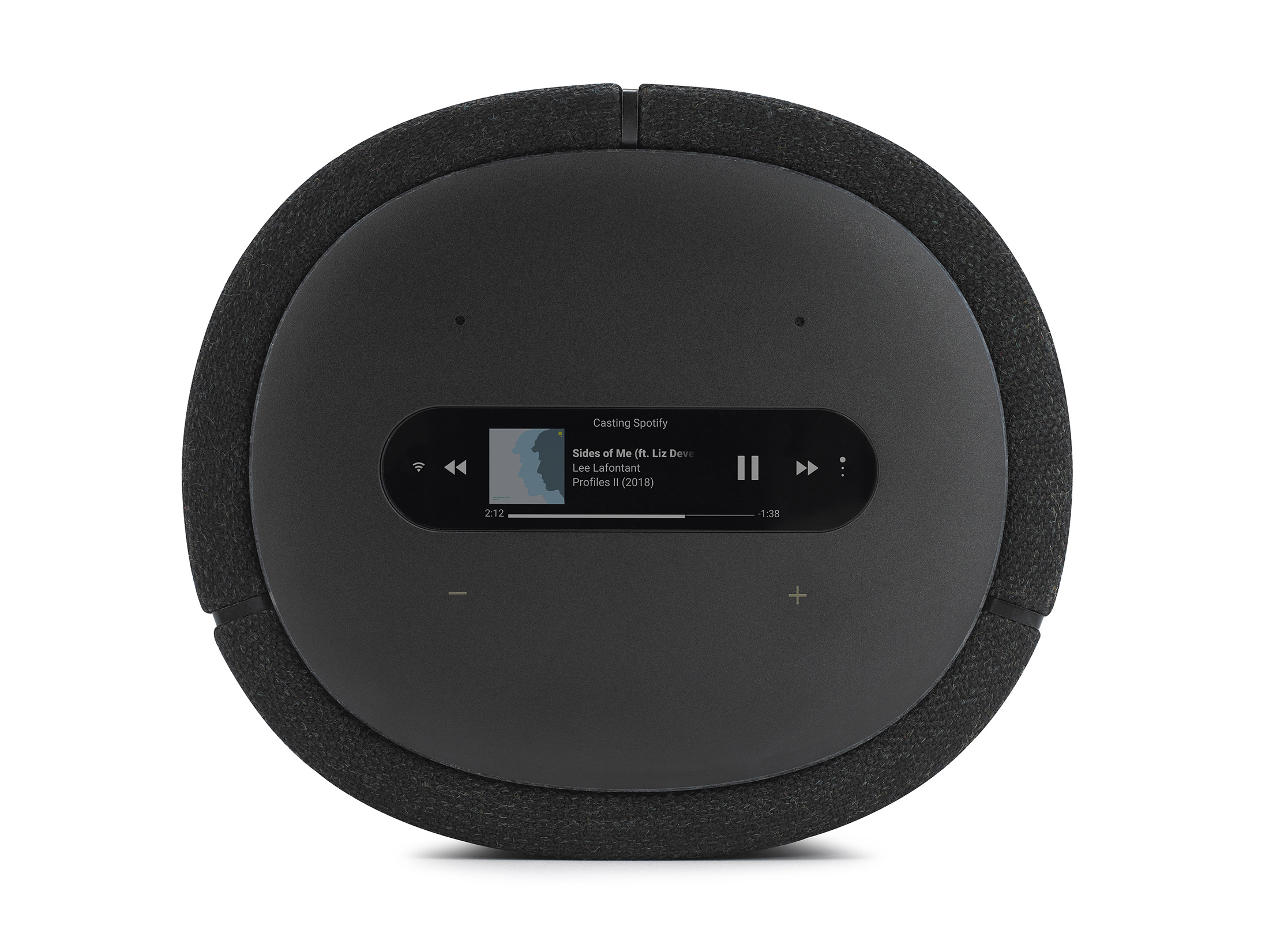 Toppen af højttalerne er af plast, og på den højre finder man et OLED-panel med touch-funktion, hvor man kan styre både afspilning af musik og opsætning af højttaleren. Panelet er skarpt og veldisponeret, og de fleste funktioner befinder sig der, hvor man ville forvente at finde dem.