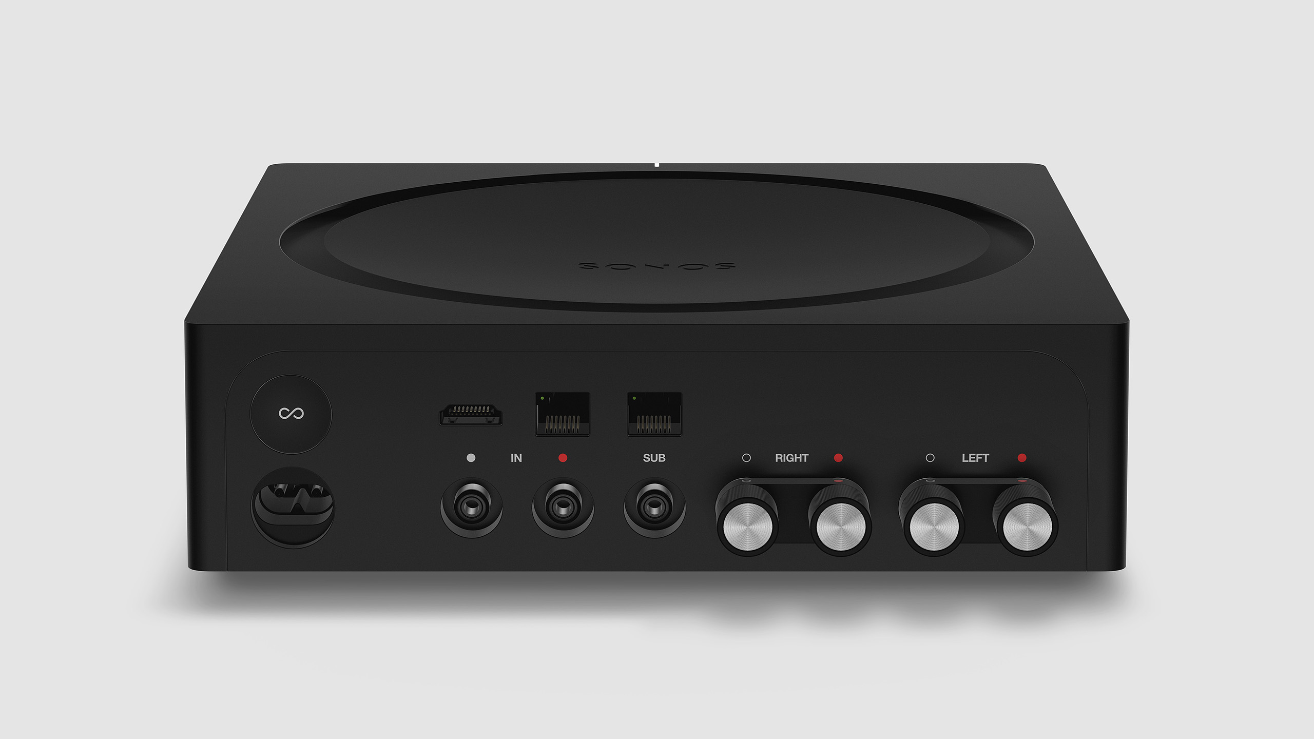 Sonos Amp har et fuldt sæt indgange: HDMI og optisk (kræver en adapter) samt et sæt rigtige RCA-indgange til analog lyd. Der er også en udgang for subwoofer. Højttalerterminalerne er snedige: Bananstik kan proppes direkte i fire huller i bagpladen. Ønsker man derimod at bruge afisolerede ledninger eller spadestik, medfølger der adaptere til at stikke i hullerne.