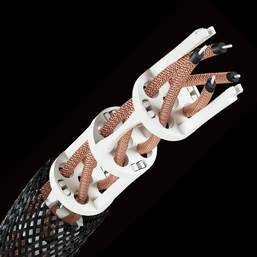 Med tyske In-akustik er vi for alvor kommet til den eksotiske ende. Kablet ser umiddelbart ud som en mørkere fætter til Audiovector, men det er overraskende let. Faktisk består det 13 mm tykke kabel mest af luft! Når man holder kablet op mod lyset, kan man gennem den vævede kabelstrømpe se, at kobberlederne er snoet i DNA-lignende spiraler, der holdes på plads af plasticholdere.