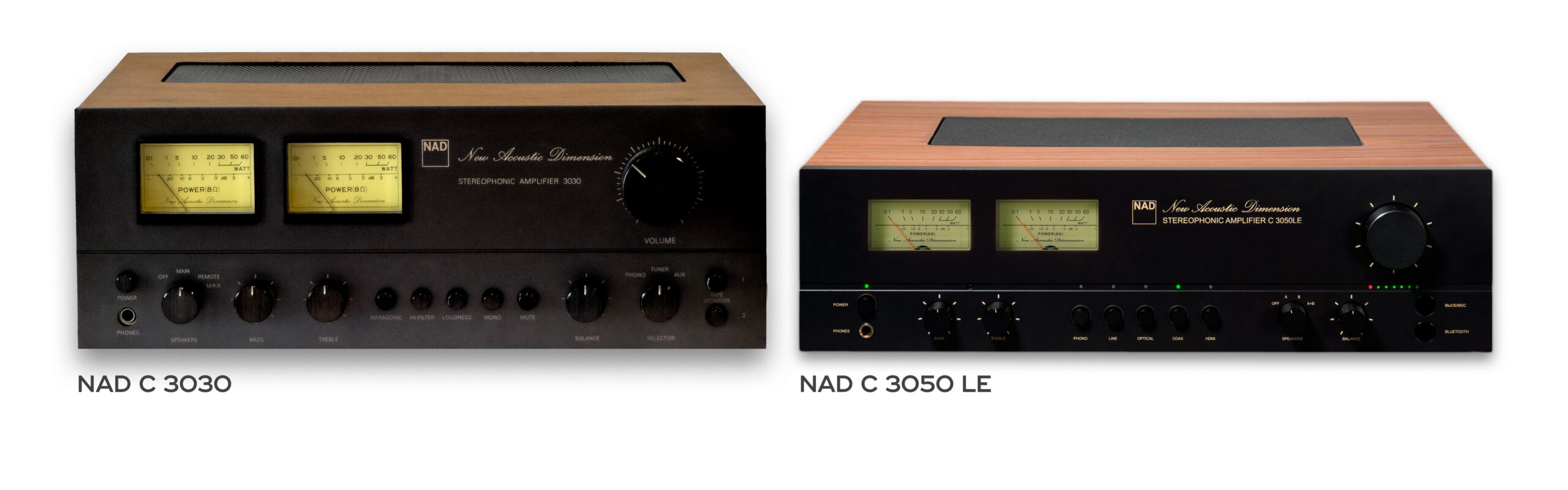 NAD C 3050 LE ligner den 48 år gamle NAD 3030 til noget nær perfektion. Kabinettet med svøb i ægte valnøddefiner er lidt lavere, men alle knapper på forpladen ser umiddelbart ud til at sidde præcis, som de gjorde i 1974. Og det samme gør de to VU-metre i øverste venstre hjørne. Logoet med ordene ”New Acoustic Dimension” i sirlig skråskrift er også identisk med forbilledet.