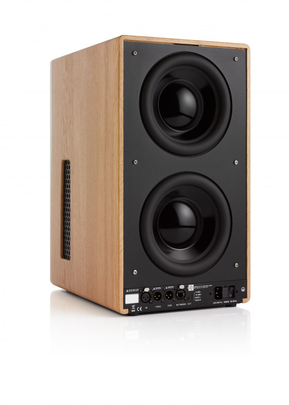 Bag på højttaleren finder man endnu to 8 tommers basenheder med aluminiummembran og lang slaglængde. De klarer området mellem ca. 30 Hz og 100 Hz.