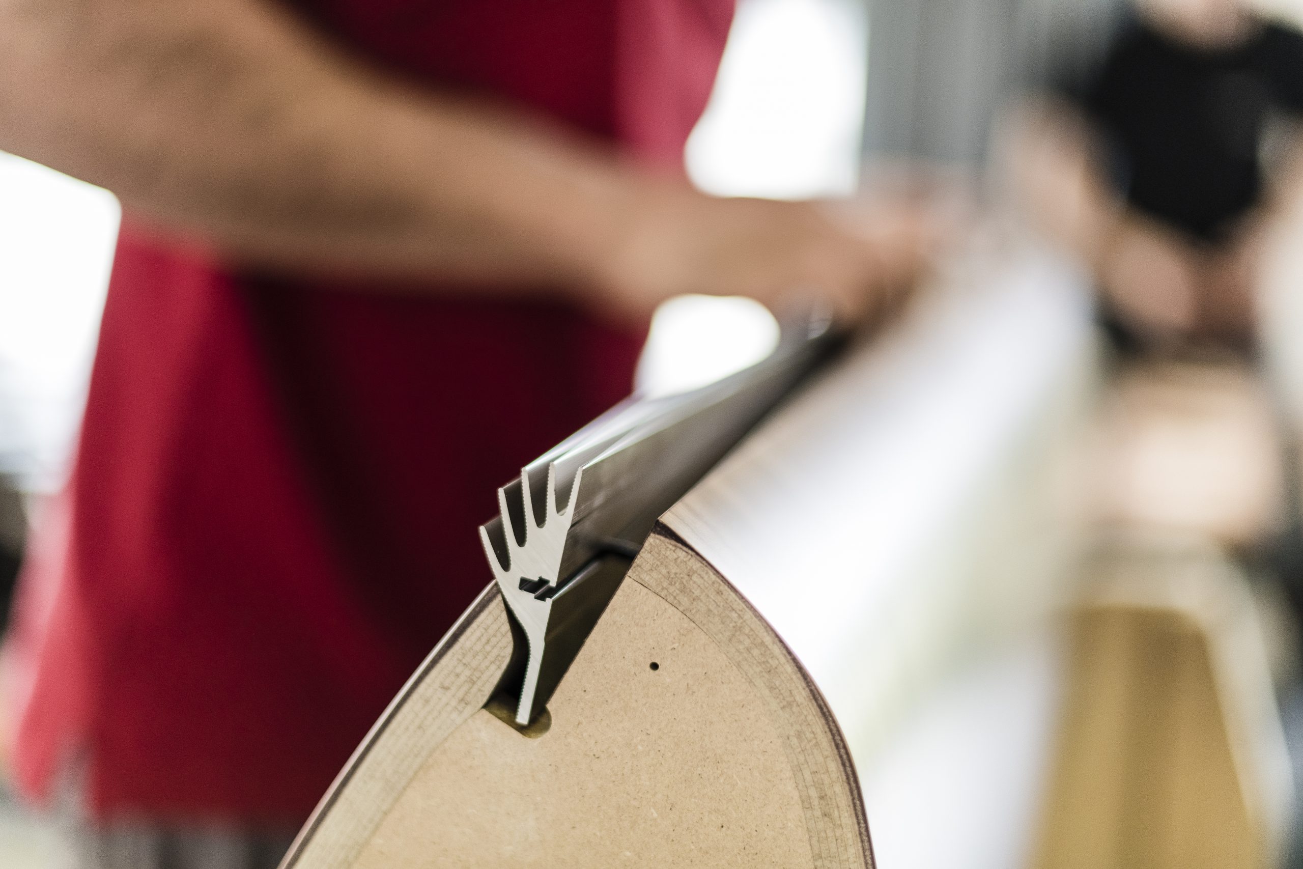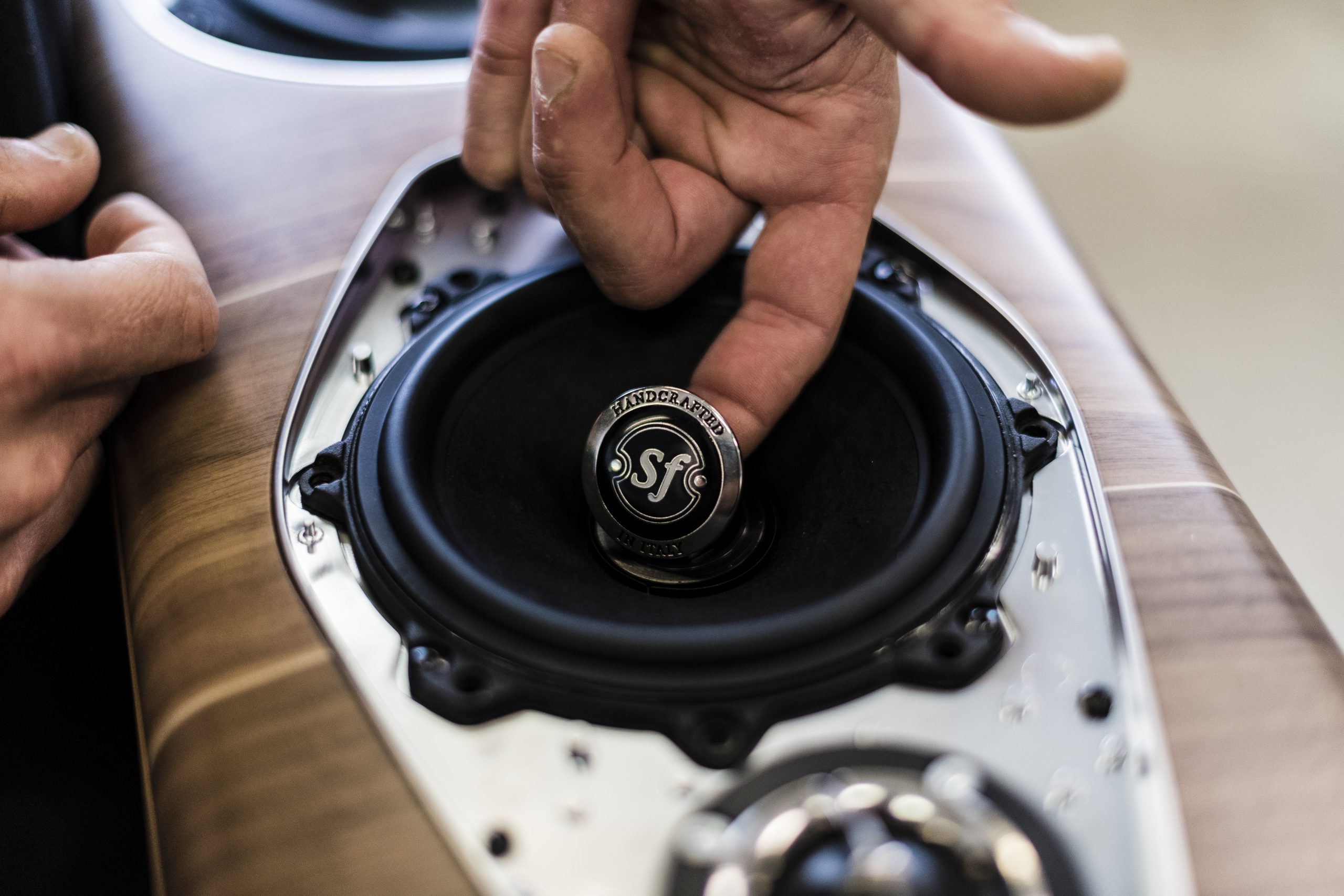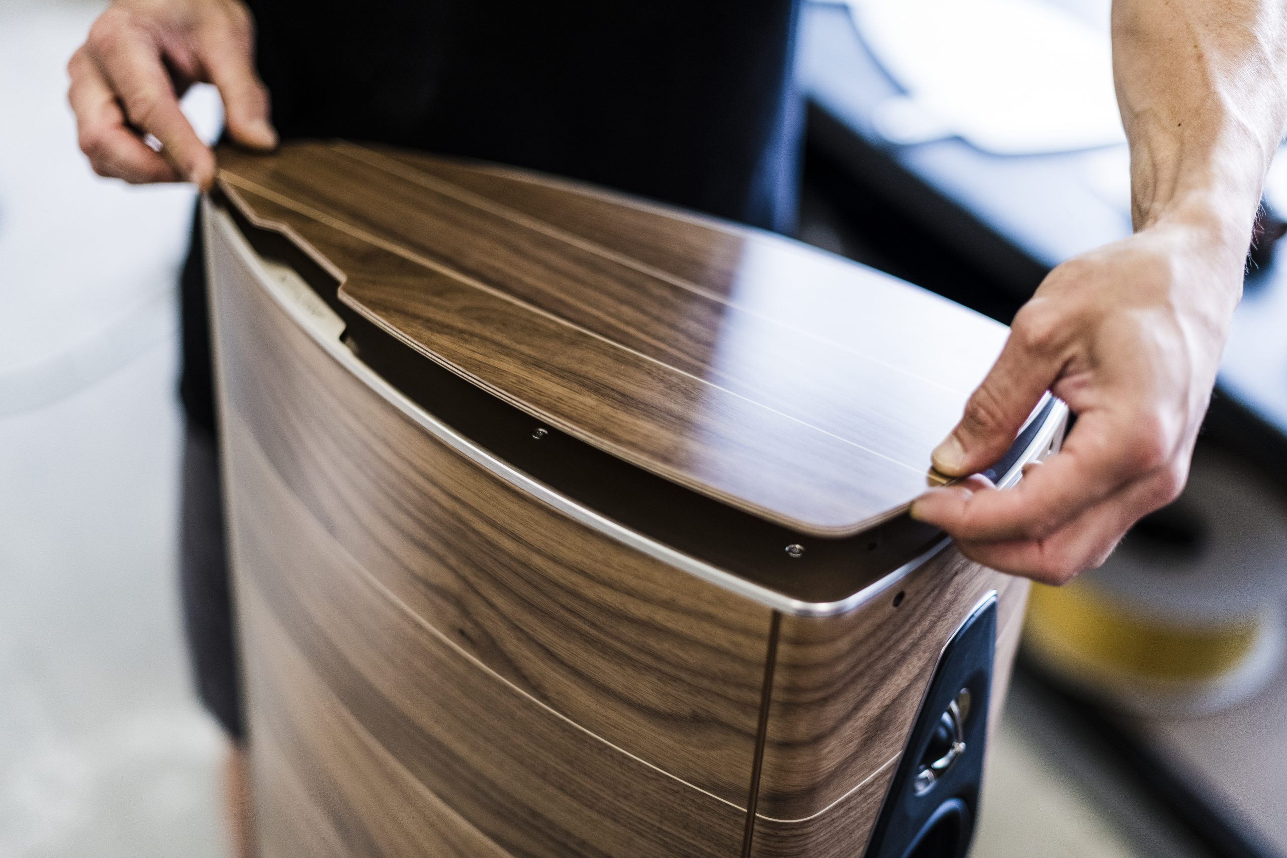De buede sider ender i Sonus fabers Stealth Ultraflex basrefleksspalte, en lodret åbning i ekstruderet aluminium, som dæmper lavfrekvent turbulens og øger rækkevidden i bassen. Top- og bundpladen er også af aluminium, men beklædt med finér i valnødde- eller wengetræ.