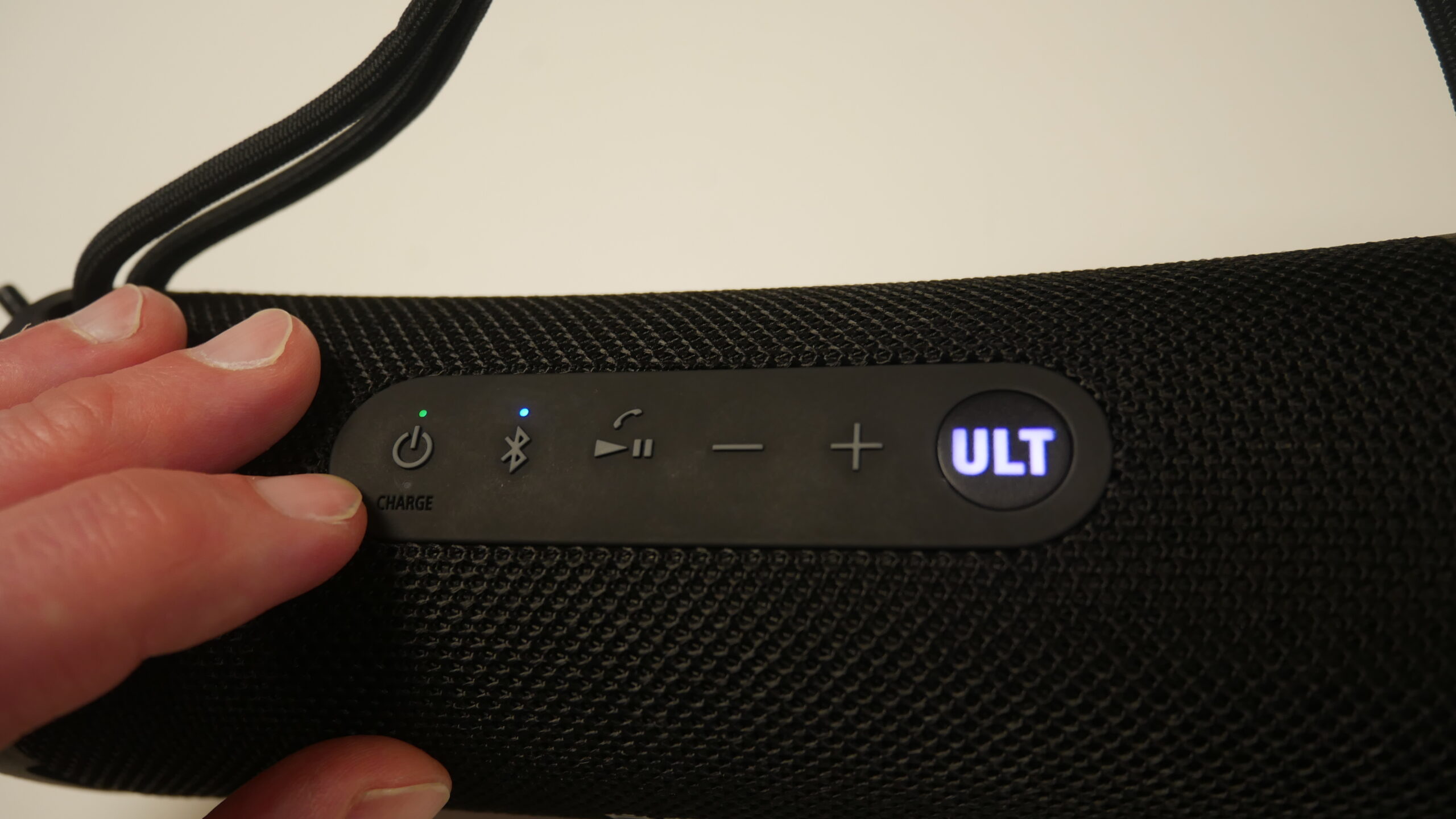 En central del af Sony-højttaleren er den karakteristiske ULT-knap, der sidder ved siden af betjeningsknapperne på oversiden. Ved et tryk på denne knap aktiveres en særlig lydtilstand med kraftigere mellemtonebas og et lidt mere sprælsk lydbillede, som er beregnet til at spille højt.