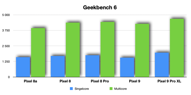 Med hensyn til rå ydelse, målt af Geekbench, er den almindelige Pixel 9 faktisk blevet langsommere(!). I modsætning hertil har Pro-modellen bevæget sig forsigtigt fremad. Men det betyder, at den er langsommere end de Asus-, Honor-, Samsung- og Xiaomi-mobiler, vi testede tidligere i år. Det gælder også for spilgrafik, hvor vi har set dobbelt så høj ydeevne som på andre mobiler i år. Den grelle undtagelse er i stedet AI. Ifølge den nyligt lancerede Geekbench AI løber Pixel 9 om hjørner med andre Android-mobiler, og det samme gør Pixel 8 Pro. Som vi bemærkede sidste år, satser Google på, at Pixel vil slå konkurrenterne ved at være den smarteste snarere end den stærkeste.