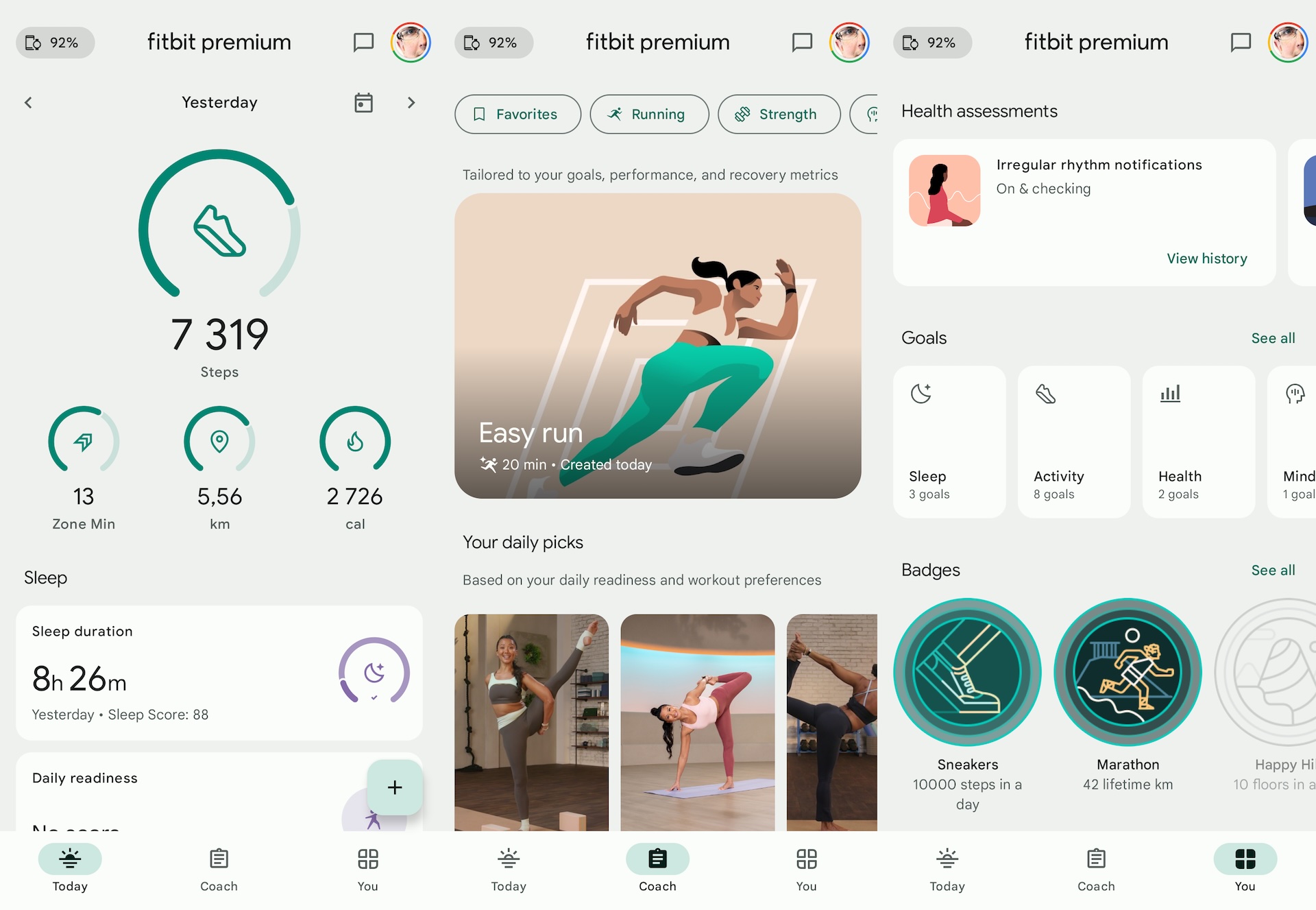 Takket være integrationen med Fitbit-app’en er der mange funktioner og finesser, som det er for omfattende at beskrive her. Man kan sætte mål og langsigtede planer, som app’en hjælper én med at opnå. Takket være AI kan app’en anbefale, hvilken træningsform der passer bedst til dig den dag. Under træningen får man coaching og overvågning, så man holder det rette niveau for at nå målet. Efter træningen kan man se analyser af, hvordan det gik, og få forslag til, hvordan man kan forbedre sit resultat. Med den nye “readiness”-funktion kan app’en også måle, hvor godt du restituerer, for at balancere træning med hvile og undgå skader.