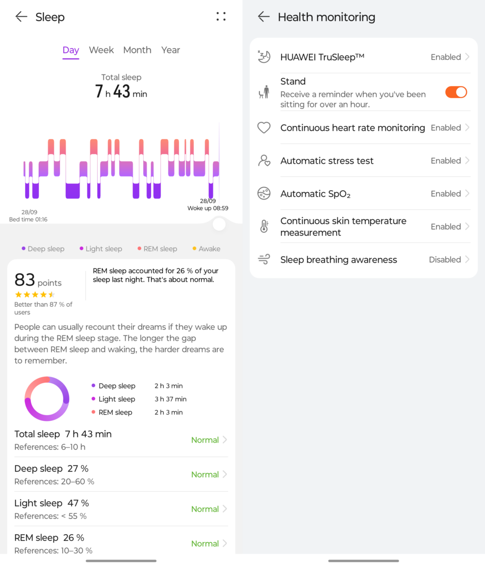Vi lod dog uret holde styr på skribentens sundhedsmålinger i testperioden. Det har f.eks. den nye TrueSeen-hjerterytmesensor, som bruger AI for at opnå bedre nøjagtighed, selv under forhold, hvor det er svært at få præcise målinger. Det måler også blodets iltniveau, hudtemperatur og en sammenkobling af disse data for at vurdere stressniveau og søvnkvalitet. Målingerne virkede fornuftige, og stemte godt overens med det andet ur, jeg bar samtidig i perioden. Uret har også en kalorietællings-funktion, så man kan registrere måltider, og sikre sig at de er i balance med træningsniveauet. Hvad det dog ikke har, er EKG-funktionen, som findes i Pro-modellerne.