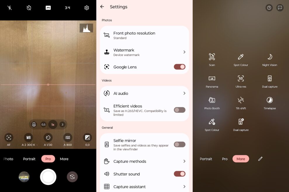 Så vidt vi kan se ud fra specifikationerne, er hovedkameraet og ultravidvinkelkameraet de samme som sidste år. Det vil sige et moderne 50-megapixel vidvinkel, som vi ser på mange andre modeller i klassen, og et standard 13-megapixel ultravidvinkel. Det, der dog skiller sig ud, er, at den nu faktisk har et telefotokamera med 3x optisk zoom. Det er meget velkomment, da det ofte er manglen på et sådant, der tvinger dig til at købe en dyrere model. Det skal dog siges, at kameraerne ikke er kalibreret i forhold til hinanden. Det normale kamera er mere farverigt, mens ultravidvinklen er mere dæmpet i farverne, og telefotoet er mærkbart mørkere. Kvaliteten direkte fra sensoren er acceptabel, men mangler detaljer og føles ret middelmådig.