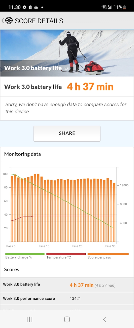 Vores benchmark-test, der stresstester batteriet så meget som muligt, viste et resultat på blot fire timer og 37 minutter, hvilket er decideret ringe. Faktisk klarer Galaxy Z Flip 4 sig sågar dårligere end sin forgænger, der immervæk klarede et resultat på over fem timer i samme test.