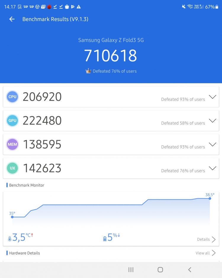 Og selv om det selvfølgelig kræver en masse kræfter og energi at drive så stor en mobiltelefon med så mange funktioner, skærme og kameraer, så klarer Galaxy Fold Z 3 sig også mere end hæderligt på den front.
