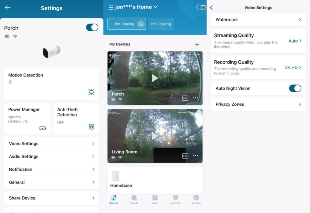 Overordnet set var vi meget tilfredse med EufyCam’s videokvalitet, og takket være 2K-sensoren blev selv små detaljer fanget. Det skal bemærkes, at kameraet har et fiskeøjeobjektiv, hvilket betyder, at selvom du får en meget bred vinkel, er billedet forvrænget. I nattilstand får du sort-hvid video takket være en IR-lampe, men der er faktisk ikke noget spotlys, hvis du vil se bedre eller optage farvevideo af en ubuden gæst.