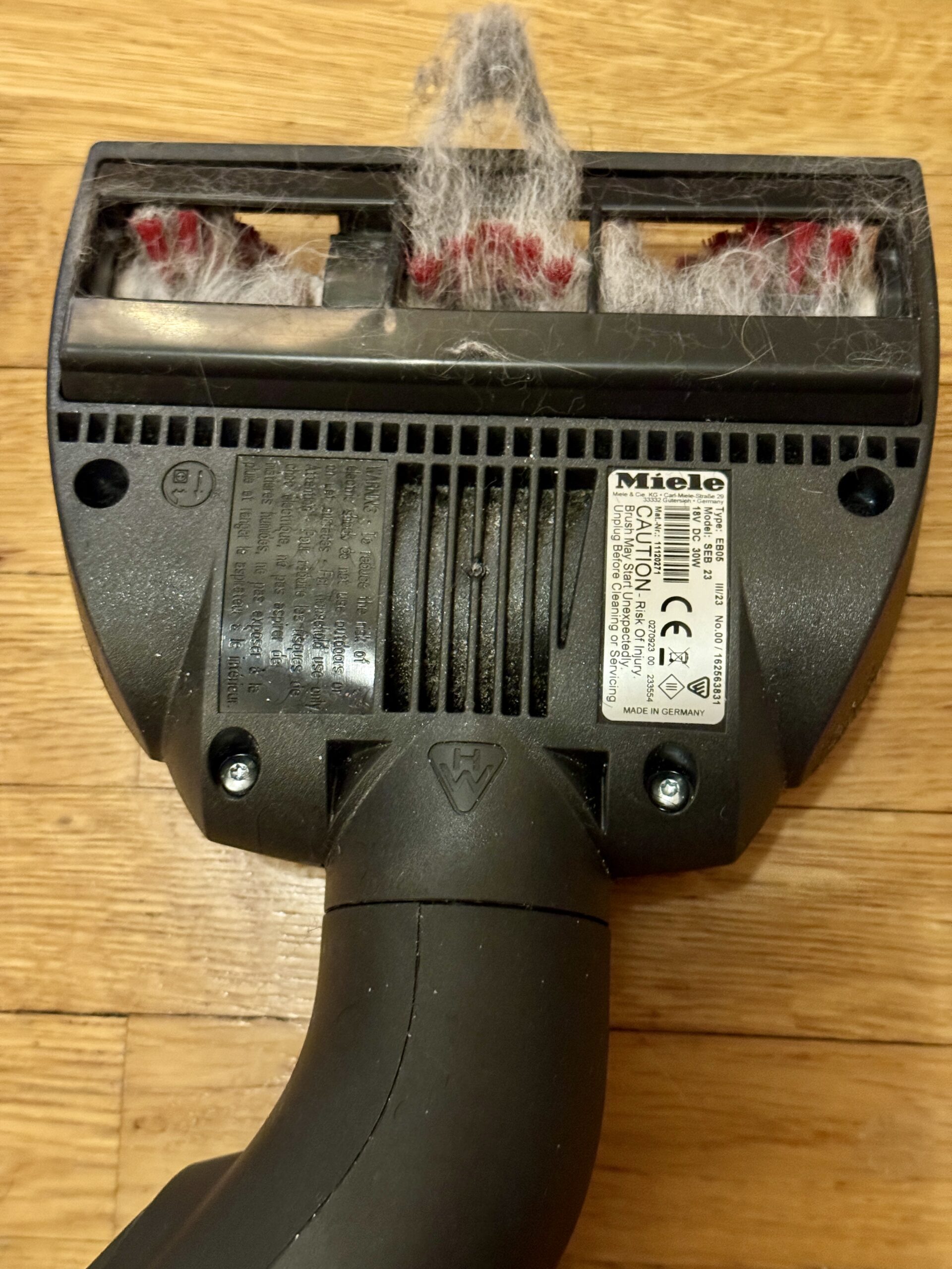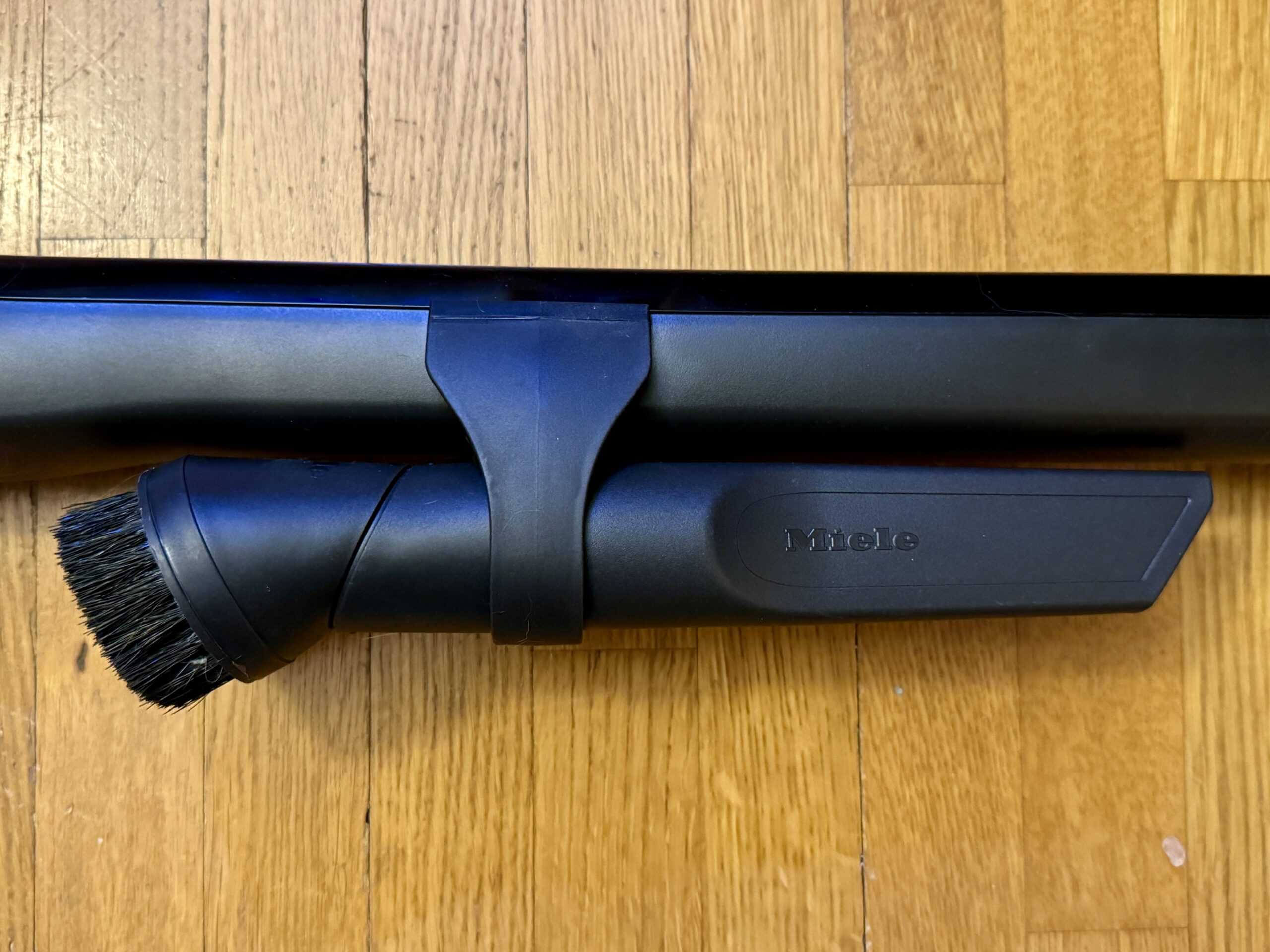 Tilbehøret har gode knapper, som man kan trykke på for at frakoble det, men nogle gange er der lidt problemer, især med håndtaget. Det er desværre noget, der kun bidrager til det plastikagtige indtryk af støvsugeren. Endnu mere mærkeligt er det, at det ikke er muligt at afmontere børsterullen på møbelmotormundstykket, eller Electro Compact-håndbørsten, som Miele kalder den, til rengøring. I stedet anbefales det at klippe tråde og hår af med en saks (!) og støvsuge resterne op. Det er så upraktisk, hvis man har kæledyr med pels, at tilbehøret stort set er ubrugeligt. Vi er heller ikke tilfredse med vægholderen, som ser ud til at være af den billigst mulige plast og konstruktion, noget man ikke ville forvente i denne prisklasse.