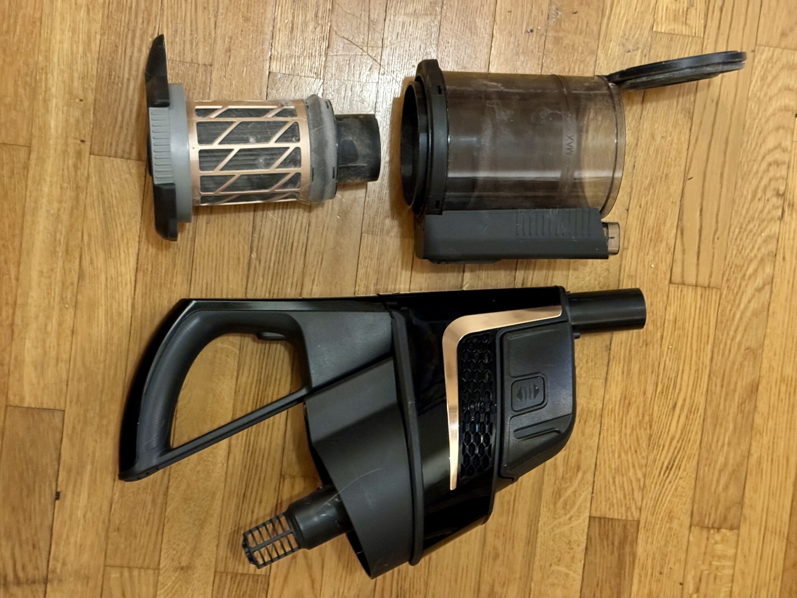 Der er en lille skyder på håndtaget, meget let tilgængelig med tommelfingeren, hvor man kan vælge mellem minimum, øko eller maksimal sugestyrke. Der er dog ingen automatik som hos mange andre. Desværre er støvsugeren blandt de tungeste i testen, og hvis den bruges som de andre, bliver man træt i armen. Men heldigvis er Mieles unikke funktion, at man kan omkonfigurere støvsugeren. Det, at man kan tage skaftet af og sætte mundstykker direkte på motoren til håndholdt rengøring, fungerer for de fleste. Men at man så kan sætte skaftet oven på motoren, så støvsugeren får et lavt tyngdepunkt, er unikt. Det er mindre anstrengende for armen og betyder også, at støvsugeren kan stå alene, hvis du har brug for en pause.