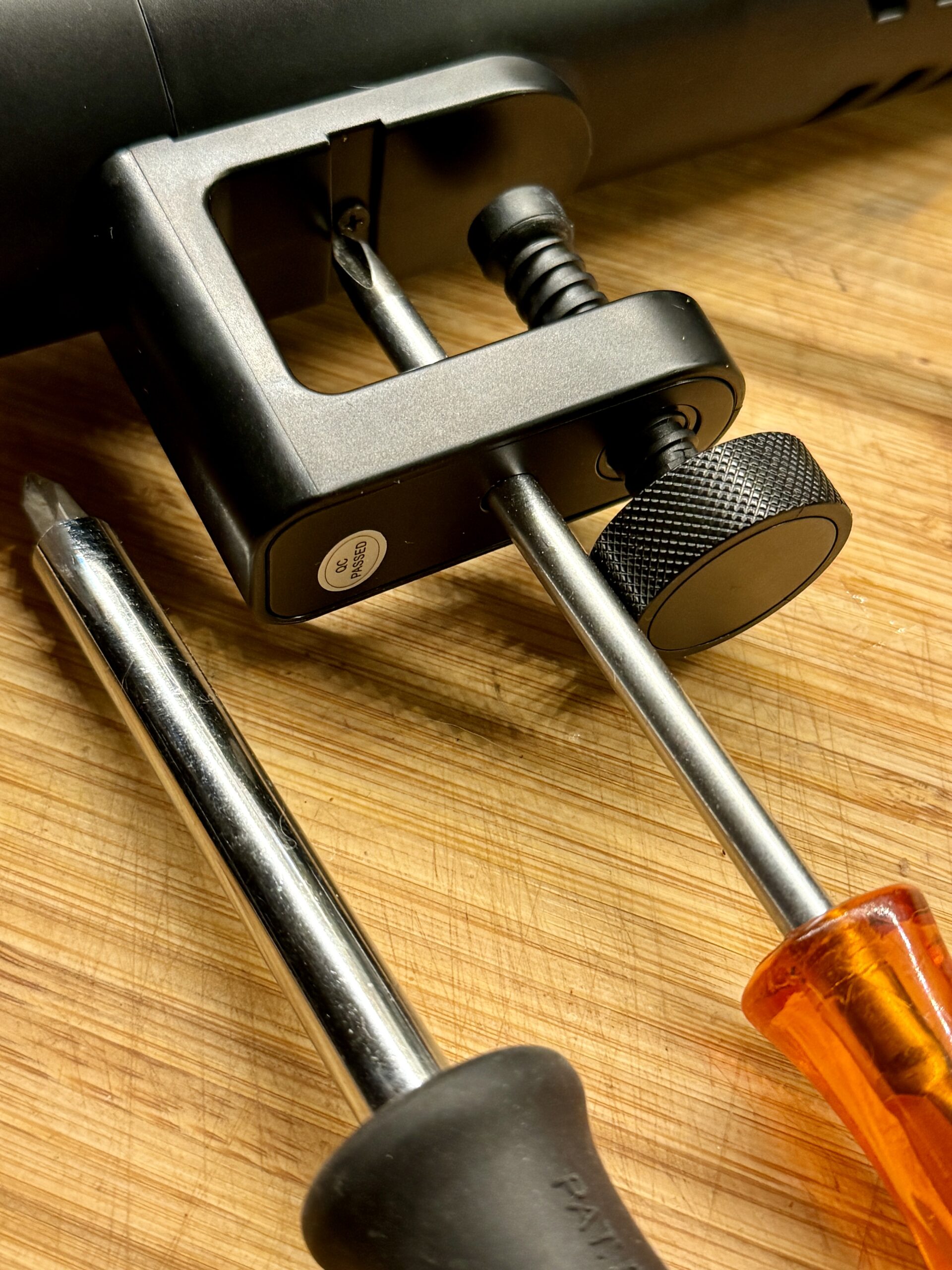 Denne stav adskiller sig fra de andre ved at have et fast beslag monteret på midten af staven med en skrue til at holde den fast på beholderen. Det gør det lidt mere kompliceret at fastgøre staven, og da højden er fast, passede den ikke til den beholder, vi normalt bruger. Derudover er konstruktionen lavet af plastik, hvilket får os til at tvivle på, hvor længe den vil holde. Denne type konstruktion gik i stykker på en stav, vi havde tidligere. Det kræver også en meget specifik skruetrækker at skille den ad, og ingen af vores passede.