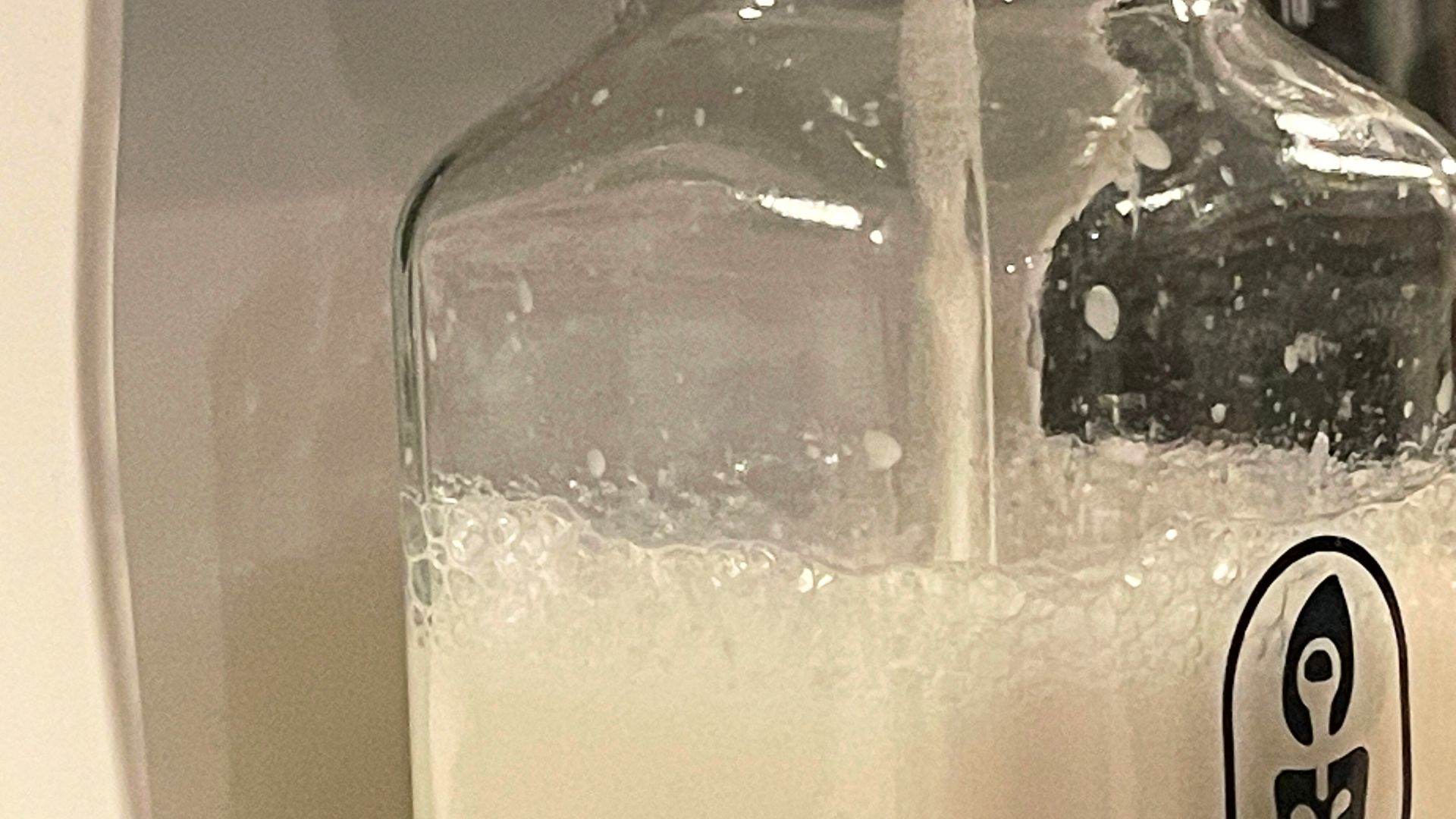 Vi starter med at lave en flaske havredrik, som udelukkende består af havregryn og vand. Billigere og enklere bliver det ikke. Maskinen kværner og brummer og efter tre minutter er flasken fuld af lys havredrik.