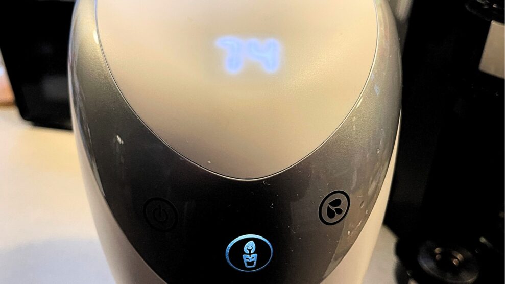 Det tager omkring tre minutter at brygge en flaske med plantedrik, og maskinen tæller ned under hver af de tre processer, den skal igennem: Kværn, blend, filtrér.