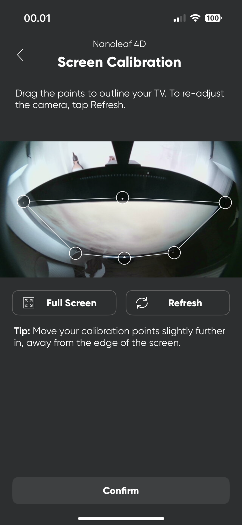 Som med Nanoleafs øvrige produkter benyttes deres app til opsætningen. Normalt er det ret ligetil, men jeg blev hurtigt overvældet af de mange indstillinger og den mangelfulde vejledning. Det startede ellers nogenlunde med kalibrering af kameraet, som jeg havde placeret i toppen af skærmen. Via app’en kan man se, hvad kameraet kan se, og skal nu markeret TV’ets fire hjørner. Det burde være simpelt, men kameraet lod til at have svært ved at aflæse den nederste del af mit TV korrekt. Om det skyldes størrelsen, 65 tommer, skal jeg ikke kunne sige, men uanset hvordan jeg vinklede kameraet, kunne det aldrig se de grønne trekanter i bund og hjørner fra instruktionsvideoen.