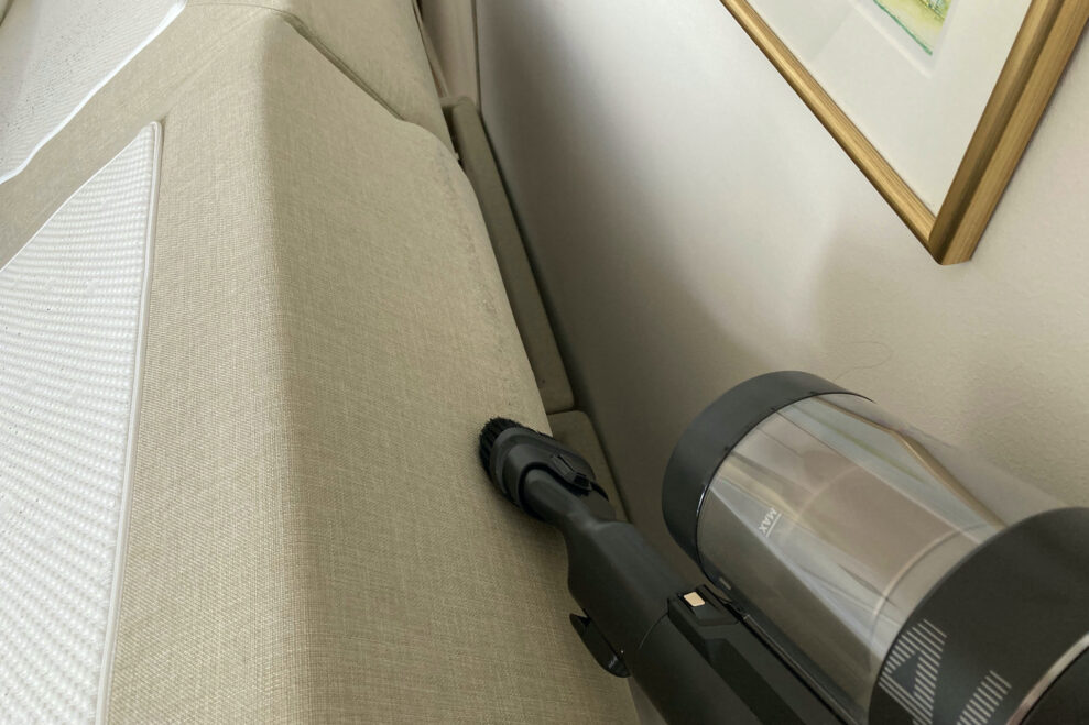 Sofaernes revner samt slibestøv langs glasdørens smalle lister (glemt fra et malerarbejde) fik også en tur. Jet AI gik strygende til værks. Både støv, krummer og sliberester forsvandt på sekundet.