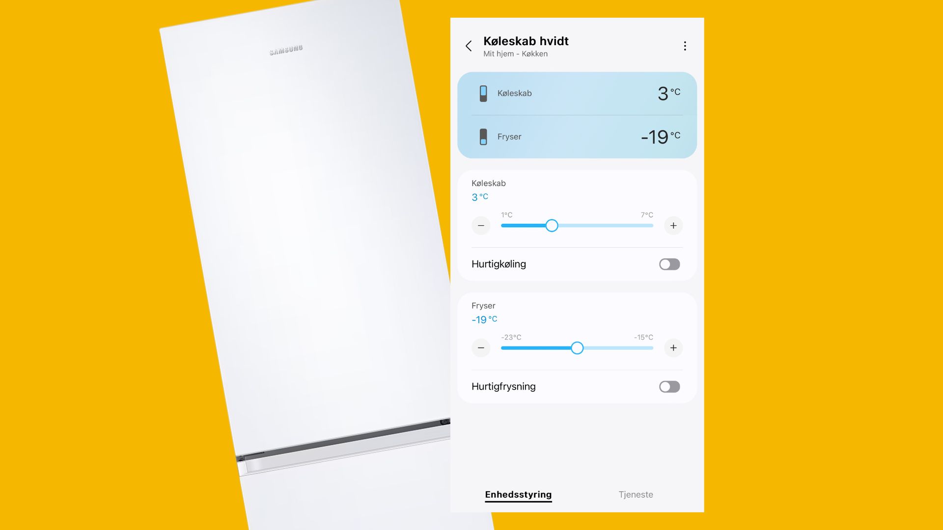 Til dette kølefryseskab kan app’en bruges til at indstille temperatur i både køle- og frysedelen inklusiv at tænde for ”hurtigkøl” og ”hurtigfrys”. Smart, hvis man er på vej hjem med noget, der skal køles hurtigt ned.