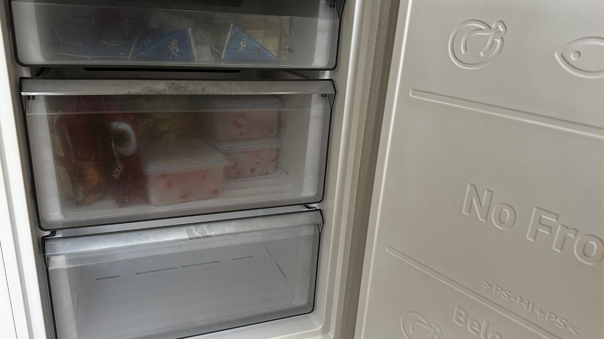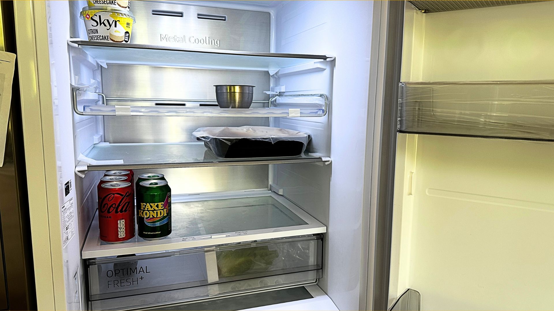 Indeni er der til gengæld en del flere detaljer med metalpladen på bagvæggen, som sikrer, at temperaturen ikke stiger, selvom køleskabet bliver åbnet ofte, og vi er positivt overrasket over skufferne nederst.