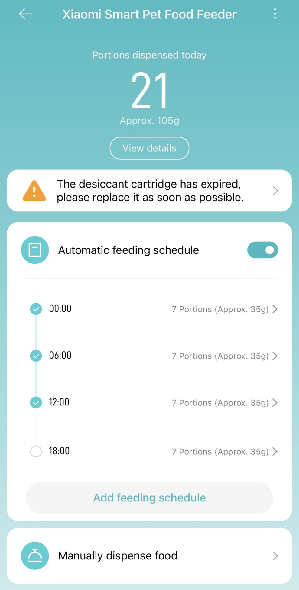 Siden automaten blev installeret, har jeg ikke haft problemer med madningen. Ædedolken undersøgte den nøje, men gav snart op og stiller sig nu tilfreds med, hvad der bliver hældt i skålen. Jeg stoler på, at portionerne er korrekte. Og jeg kan slappe af med hensyn til madning, da jeg får en notifikation på mobilen, hver gang der er hældt mad op. Dejligt, når man ikke er hjemme. Og skulle der ske strømafbrydelse, kan den faktisk drives med almindelige batterier som backup! Man får endda en notifikation dagen før beholderen løber tør for mad om, at det er tid at fylde op. En arrig lampe på automaten lyser desuden op, så man ikke glemmer det.