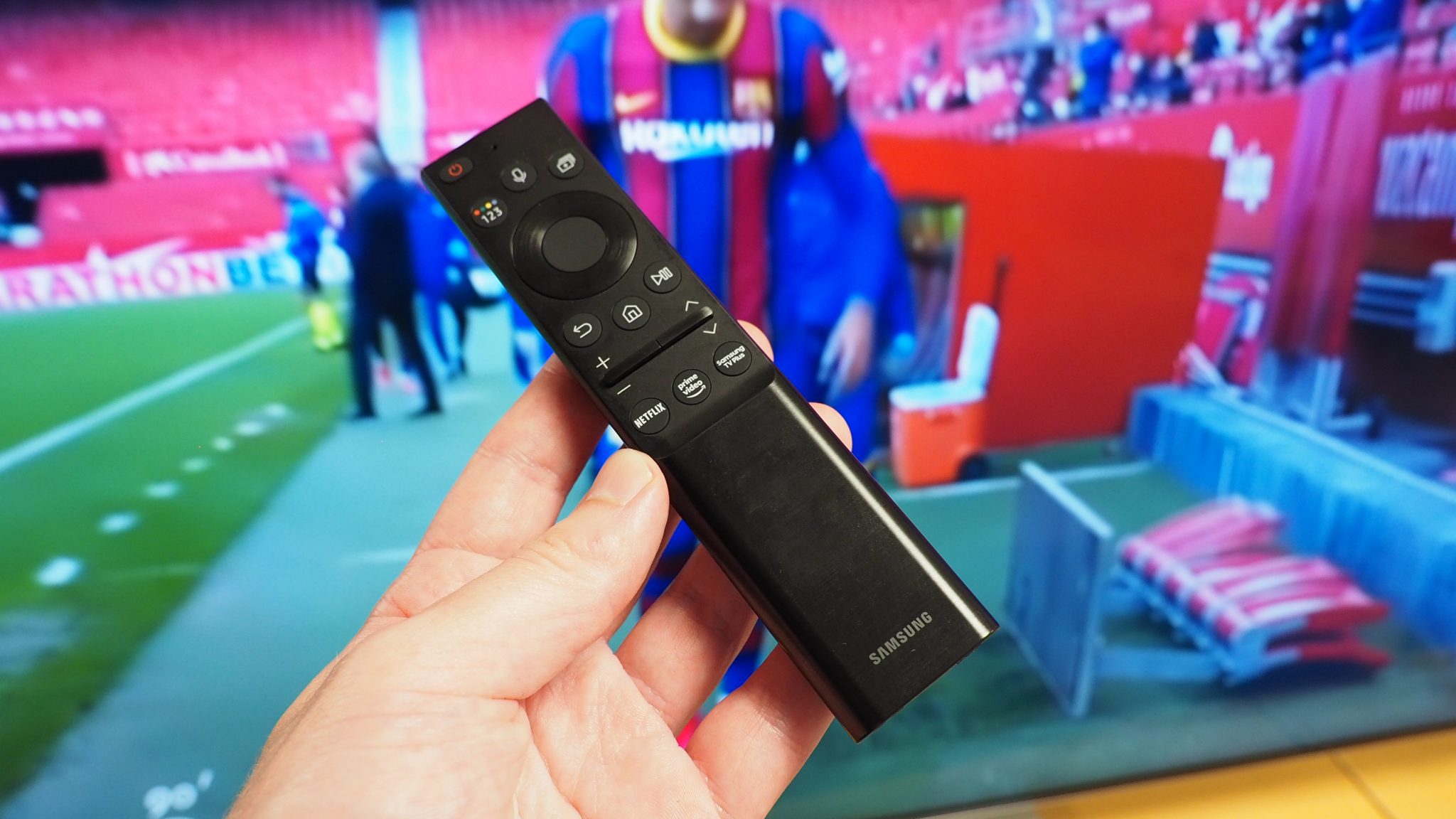 Den saftige kontrast bidrager også til, at QN85A får en meget stærk og nuanceret farvegengivelse. Kombinationen af Mini-LED og IPS virker faktisk ret vellykket, idet farverne bevares, selv når vi betragter skærmen fra siden. Det grønne græs og spillerens dragter stråler mod os med en besnærende glød og realisme.