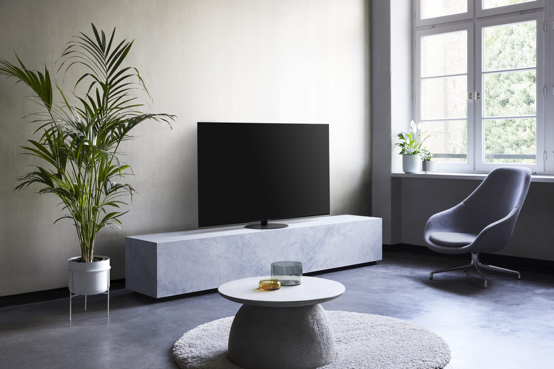 Den centralt monterede fod er nem at sætte på og giver et solidt indtryk. Den har også den fordel, at den kan drejes – smart, hvis TV’et skal stå i et hjørne, eller når man har flere alternative siddepositioner.