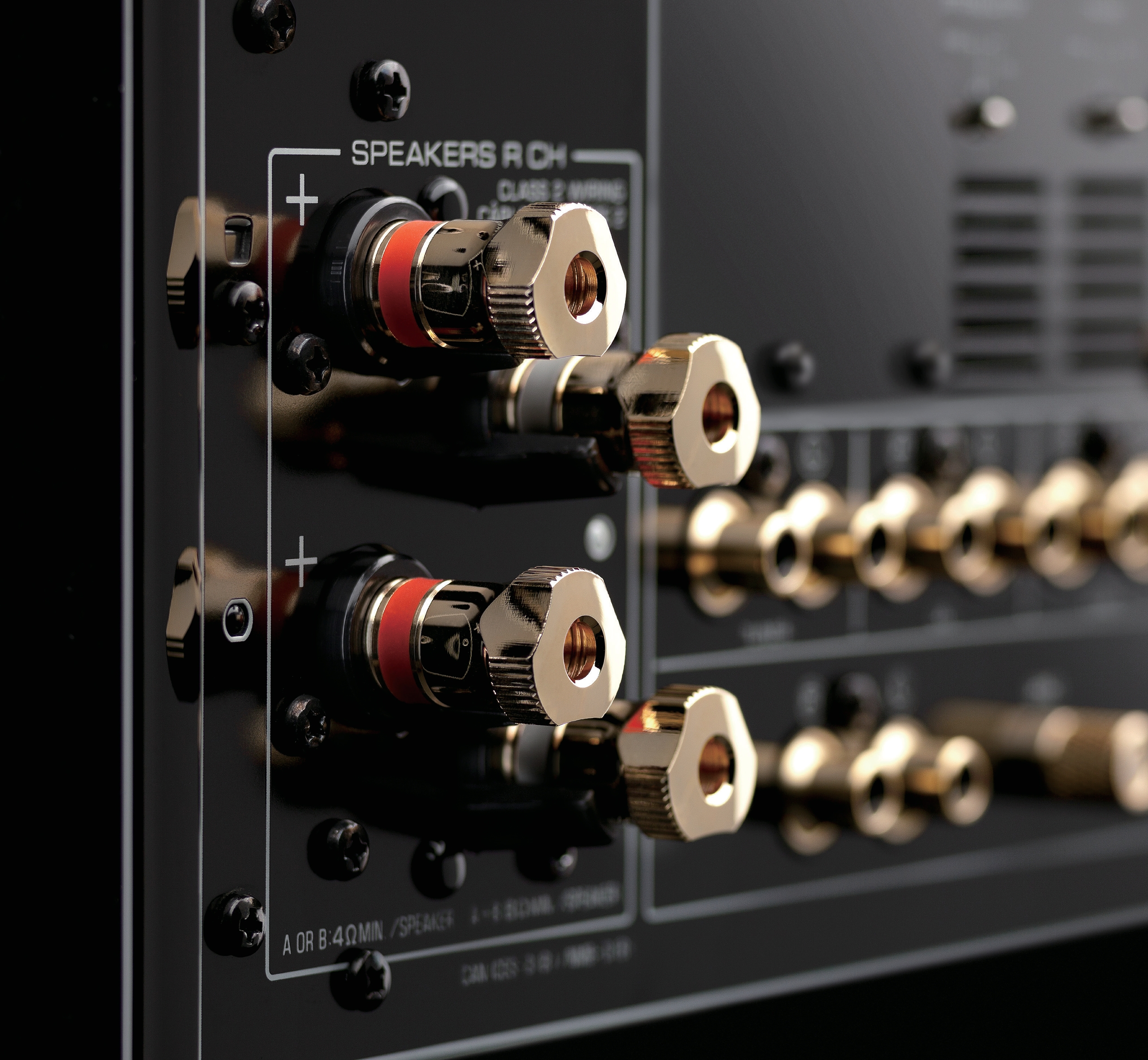 Det står ikke dårligere til på bagsiden, hvor solide dobbelte højttalerterminaler flankerer en række gyldne analogindgange, deriblandt en balanceret indgang (som man kan vende polariteten på) og en pladespillerindgang.