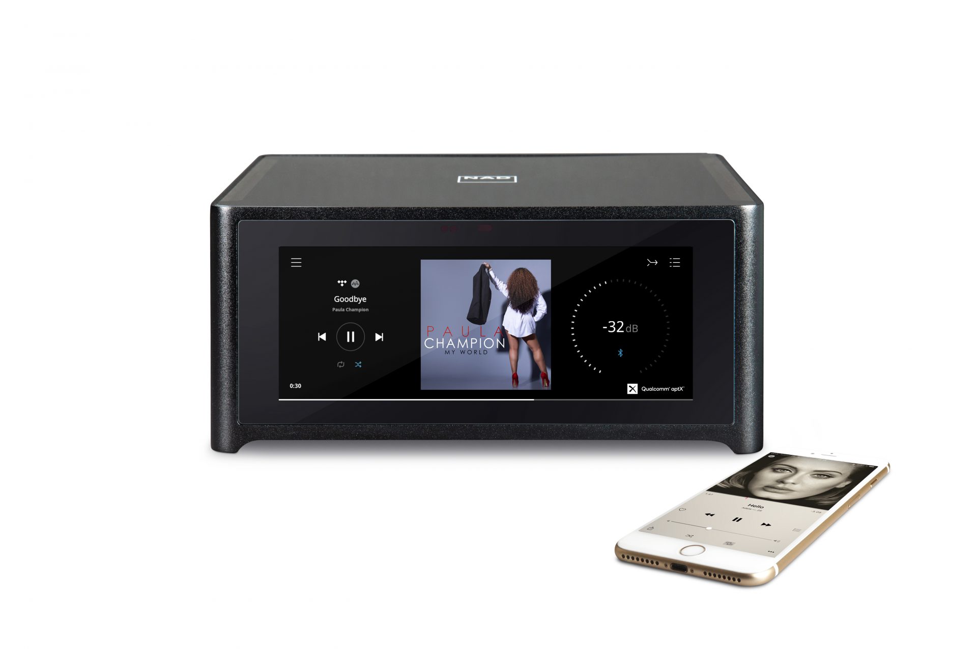 NAD M10 ser ikke ud af meget på toppen af stereomøblet. Men det er heller ikke der, man normalt ville anbringe den. Den lille enhed er som skabt til at blive skubbet ind på en reolhylde eller stå oven på en skænk. Når apparatet er slukket, er hele overfladen højglanssort. Først når man tænder den med en berøring, lyser hele glasfronten op i et touch-display.