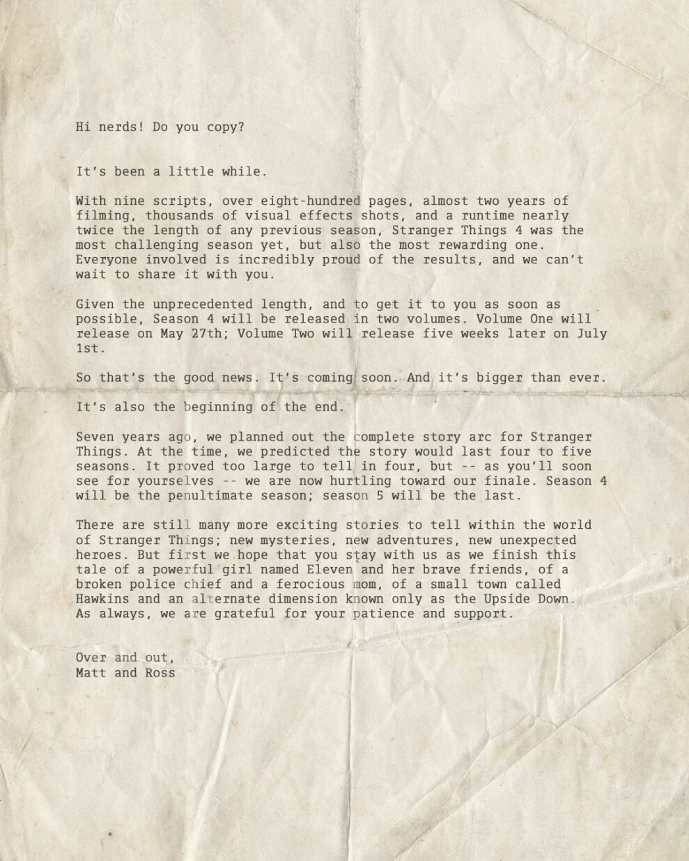 4. sæson af Stranger Things får global premiere på Netflix den 27. maj. Sæsonen er som nævnt opdelt i to dele, hvor Del II (yderligere seks afsnit) kommer den 1. juli.