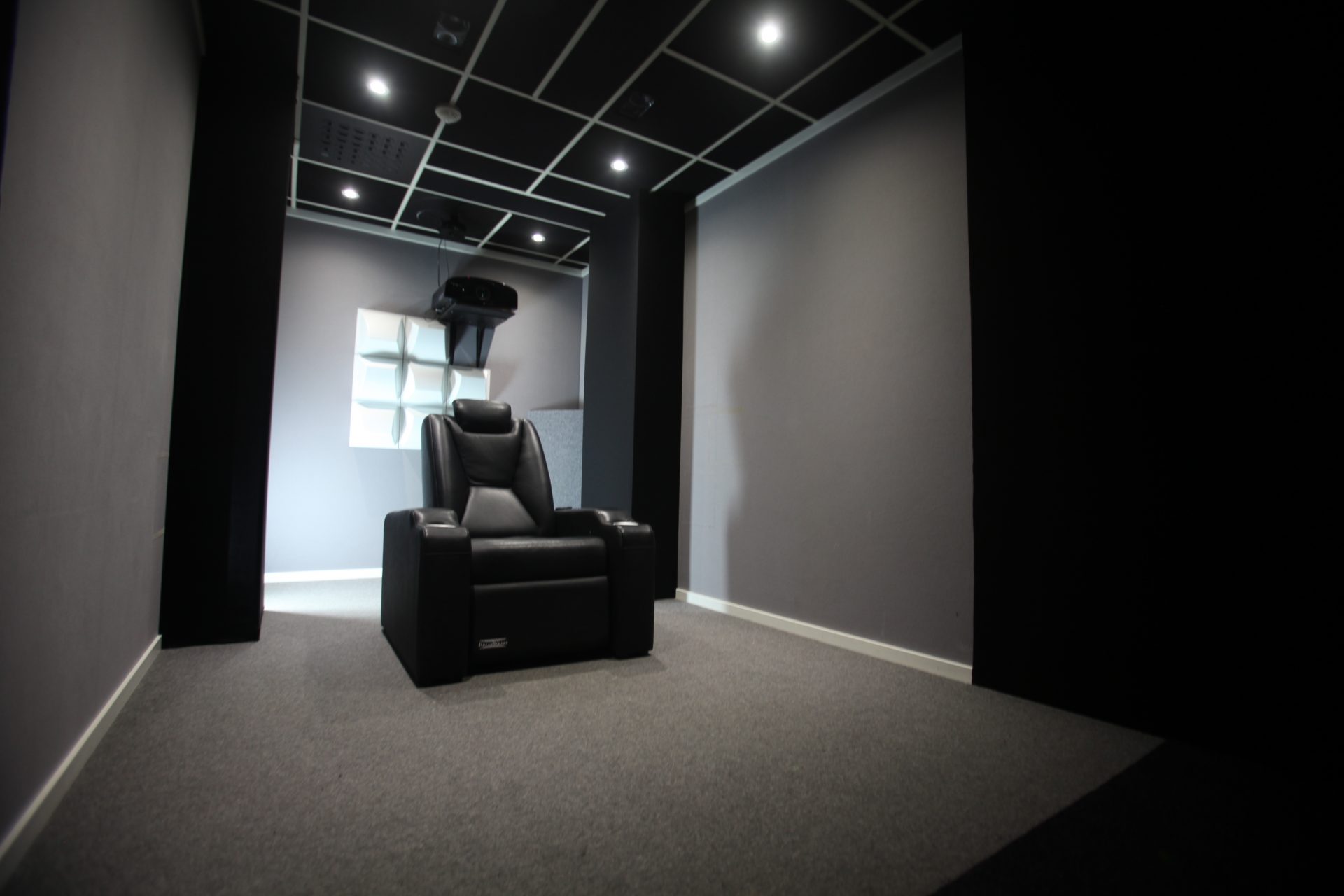 Væggene er betrukket med gråt og sort Molton-stof, der er kendt for sine lys- og lydabsorberende egenskaber. På gulvet ligger der et gråt gulvtæppe, mens loftet har lydisolerende plader af den slags, man ofte finder på kontorer. De mørke og lysabsorberende materialer reducerer genskin på lærredet og hjælper med at bevare kontrasten i billedet. (Foto: AV Shop)