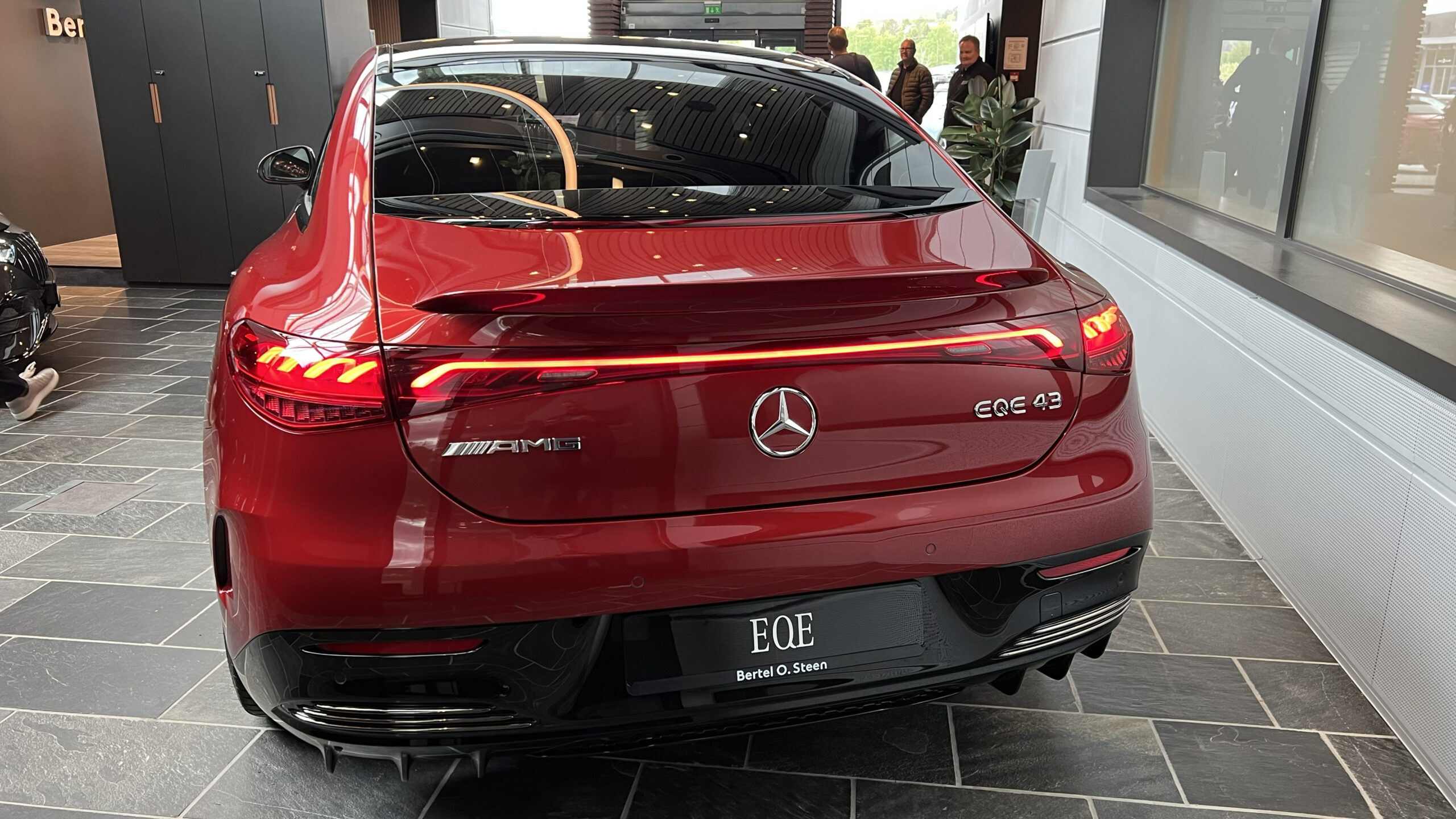 Mercedes-AMG EQE 43 4Matic er den første i EQE-klassen, der kan bestilles. Den røde og den grå på billederne er allerede registreret, og kunder kan snart blive skrevet op til en prøvekørsel hos udvalgte forhandlere, som også kan tage imod bestillinger. AMG-versionen på billederne har to elmotorer med i alt 476 hk effekt, som giver bilen firehjulstræk, af Mercedes kaldet 4Matic.