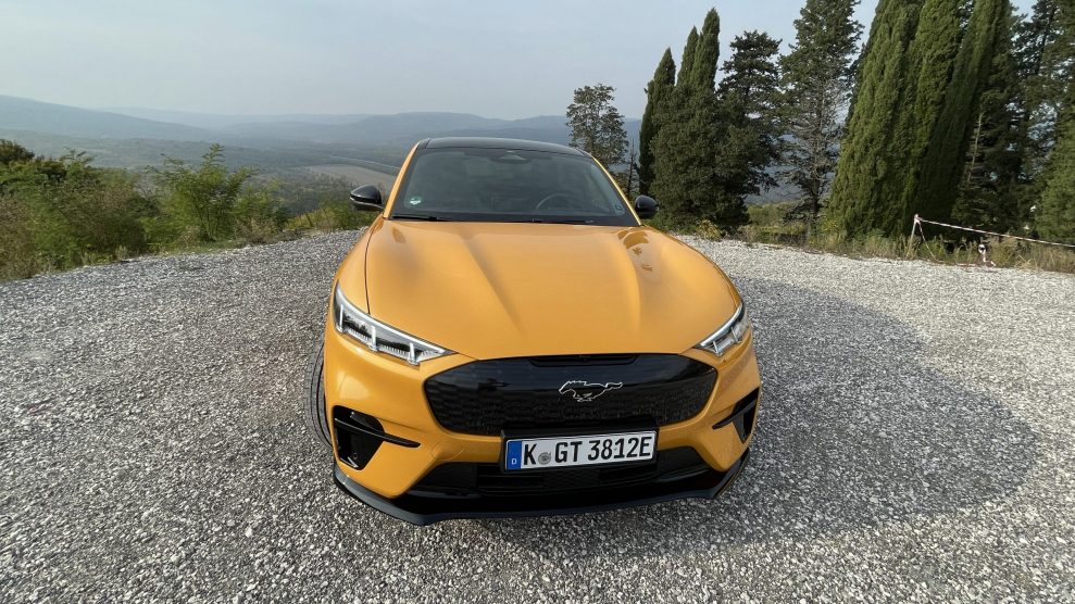 Det var en varm, solrig dag i Rovinj i Kroatien og perfekte forhold til at testkøre Ford Mustang Mach-E GT – den mere sportslige udgave af Mach-E. Da vi kom frem, stod der biler på rad og række i farverne lys orange (Cyber Orange) og kongeblå (Grabber Blue). Undertegnede syntes, at orange var sejest, og gik direkte efter den.