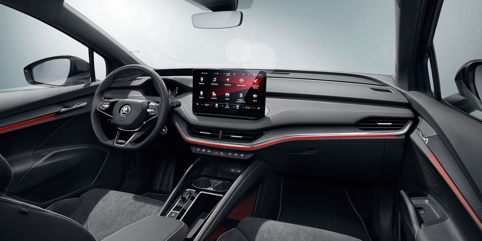 Indeni finder vi sportssæder med integreret nakkestøtte og desuden et mere sporty rat med tre eger. Det kan også vælges som tillægsudstyr på standardudgaven af Enyaq iV. Desuden fås Sportline-versionen med sorte sæde- og tagbetræk, og med instrumentbræt betrukket med sort kunstlæder med grå kontrastsømme.