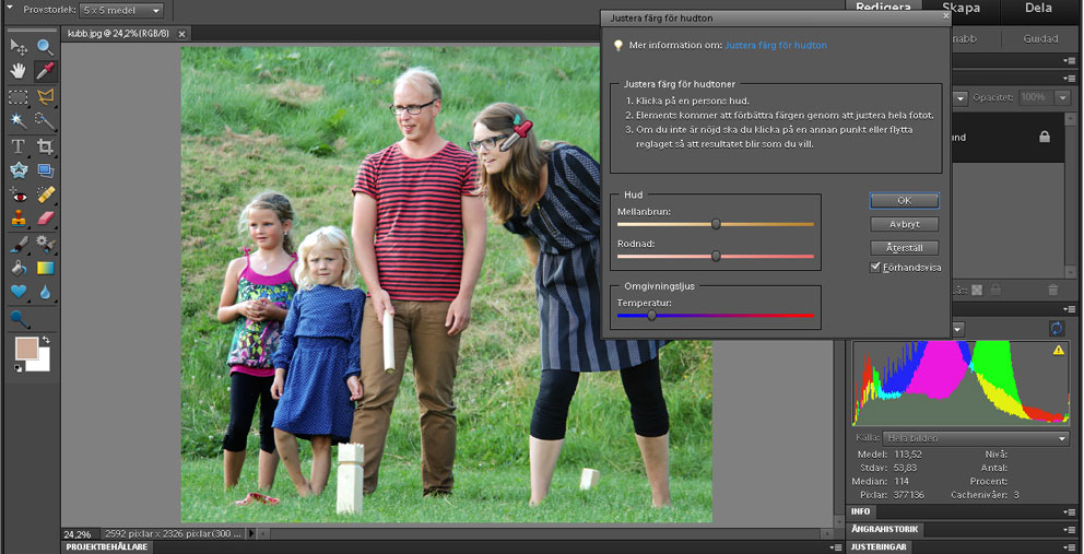 Justér farve efter hudfarve (forbedre/justere farve/justere farve efter hudtone), er Photoshops forslag til en løsning. Når den aktiveres, kommer der en boks med indstillinger plus en lille pipette, der kan bevæges i billedet. Hvis man klikker med denne pipette i et ansigt, justerer den farven til en rimelig ansigtsfarve. Og i dette tilfælde bliver hele billedets farvebalance også god, og omtrent den samme som med de manuelle variationer.