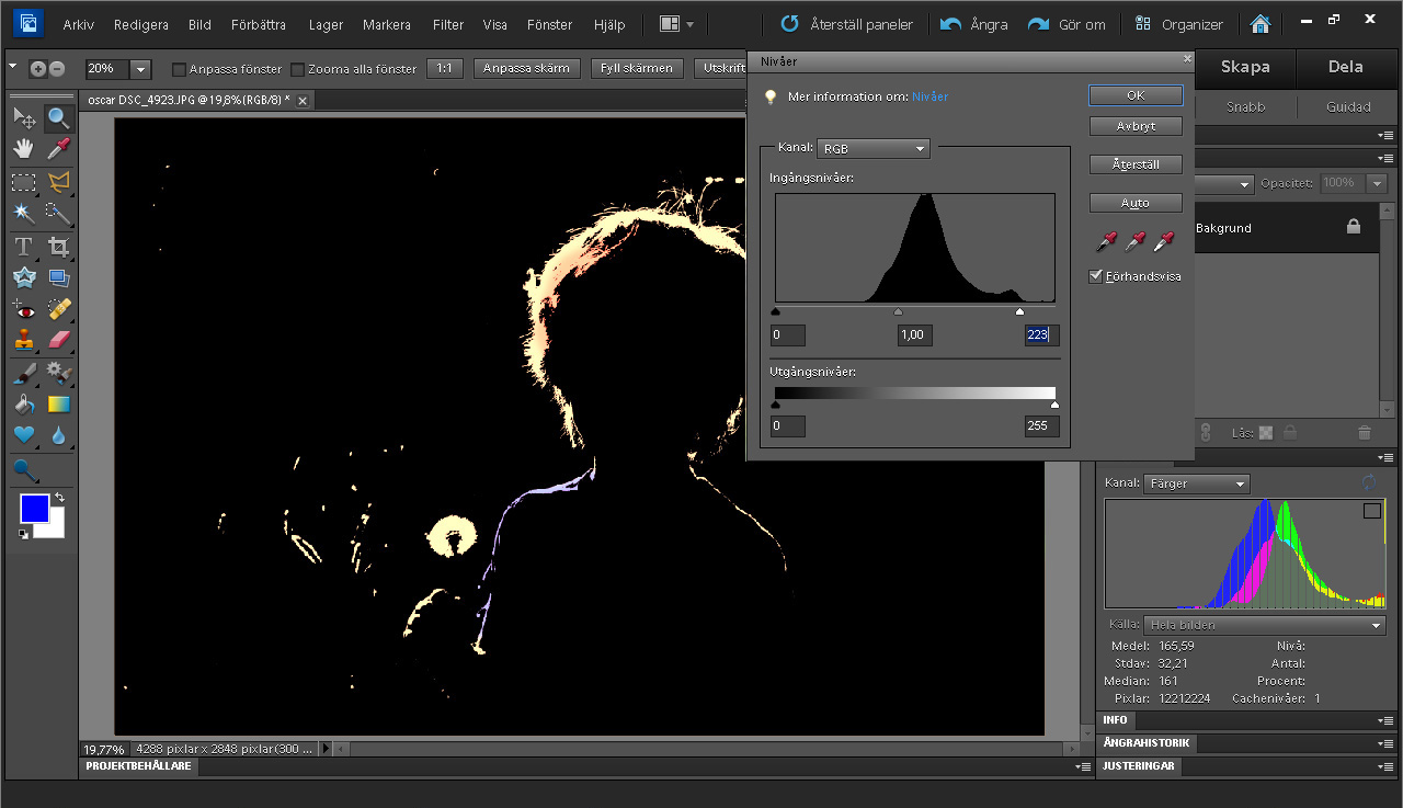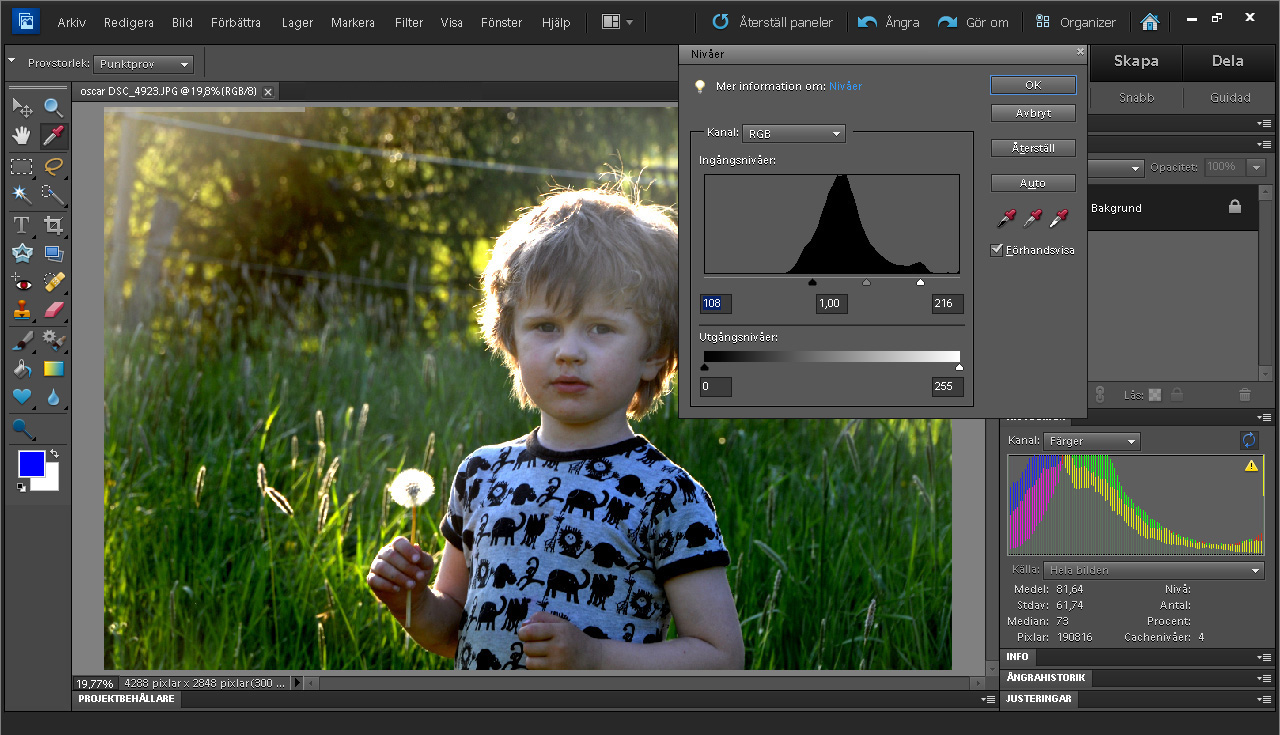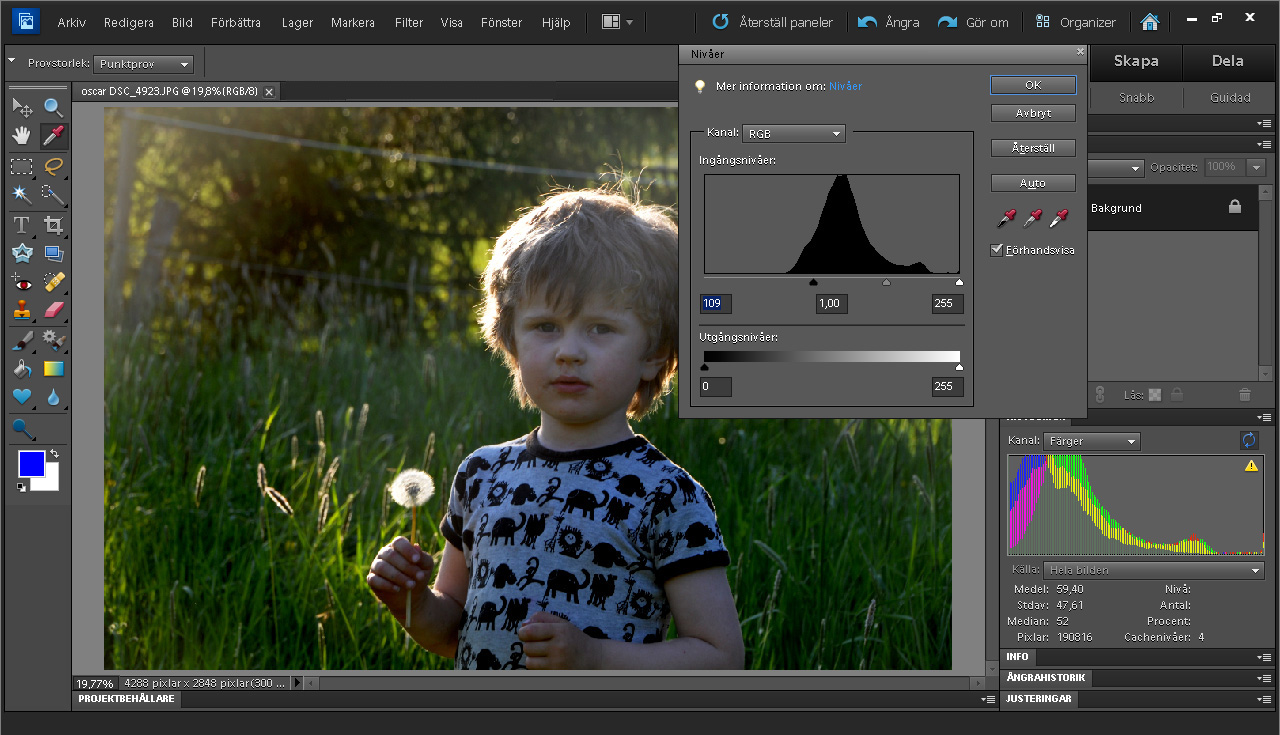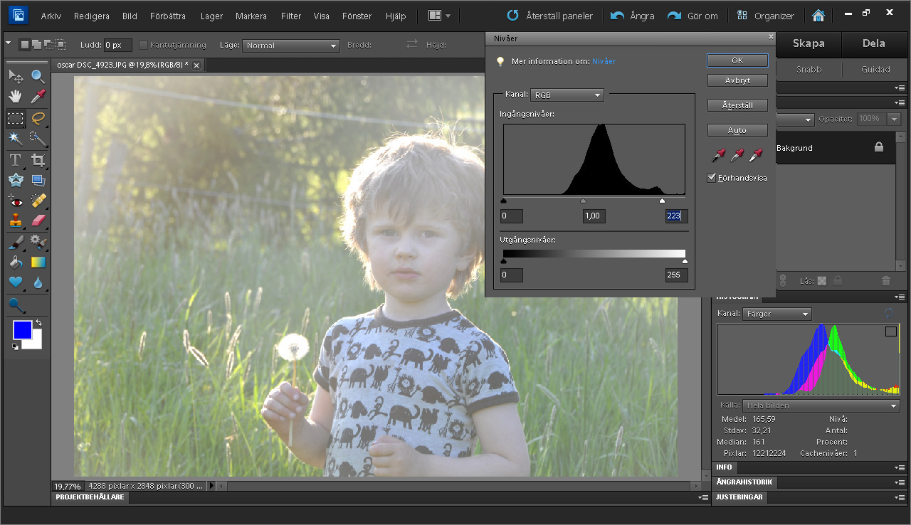 Og den justering kan gøres endnu lettere. Photoshop Elements og mange andre programmer har en direkte funktion, som kaldes autoniveauer (auto levels). Resultatet bliver dog ikke altid helt det samme i alle programmer.