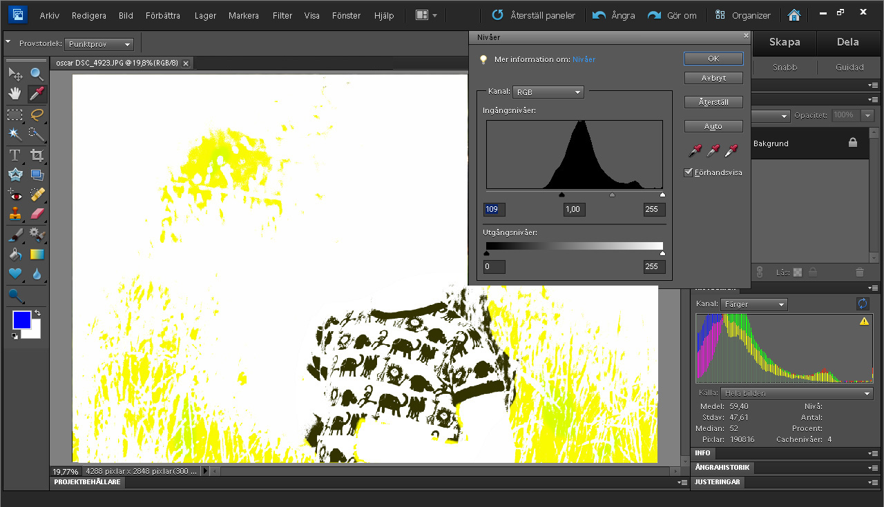 I eksemplet er justeringen af de sorte niveauer lavet på originalbilledet, og det bliver da ret mørkt. Man kan se, at det frem for alt er det sorte mønster på trøjen og den gule farve i en del af baggrunden, der er taget bort.