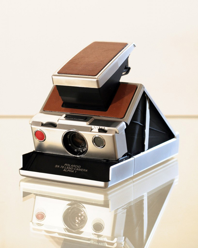 Det mest elegante af alle Polaroid-kameraer er SX-70 fra 1972. Et sammenklappeligt spejlreflekskamera, der tog Polaroid-film i kassetter og fremkaldte billederne på stedet. Et mirakel! Man kunne selv vælge blænden, fra f/8.0 til f/22, mens kameraet valgte lukkertiden. Den velkendte røde knap er udløserknappen, og på toppen sidder søgeren. Billederne kommer ud foran, når eksponeringen er færdig.